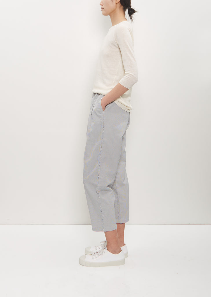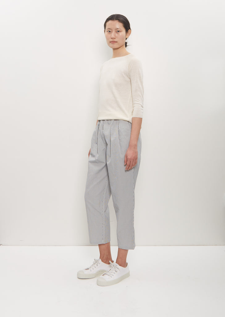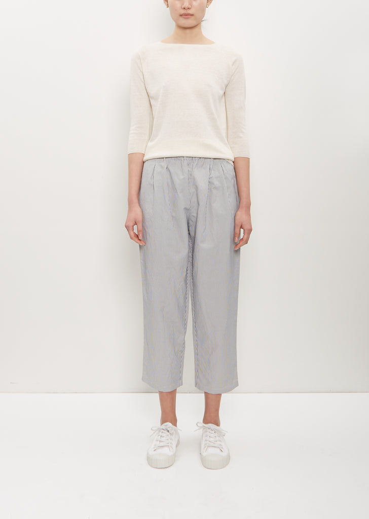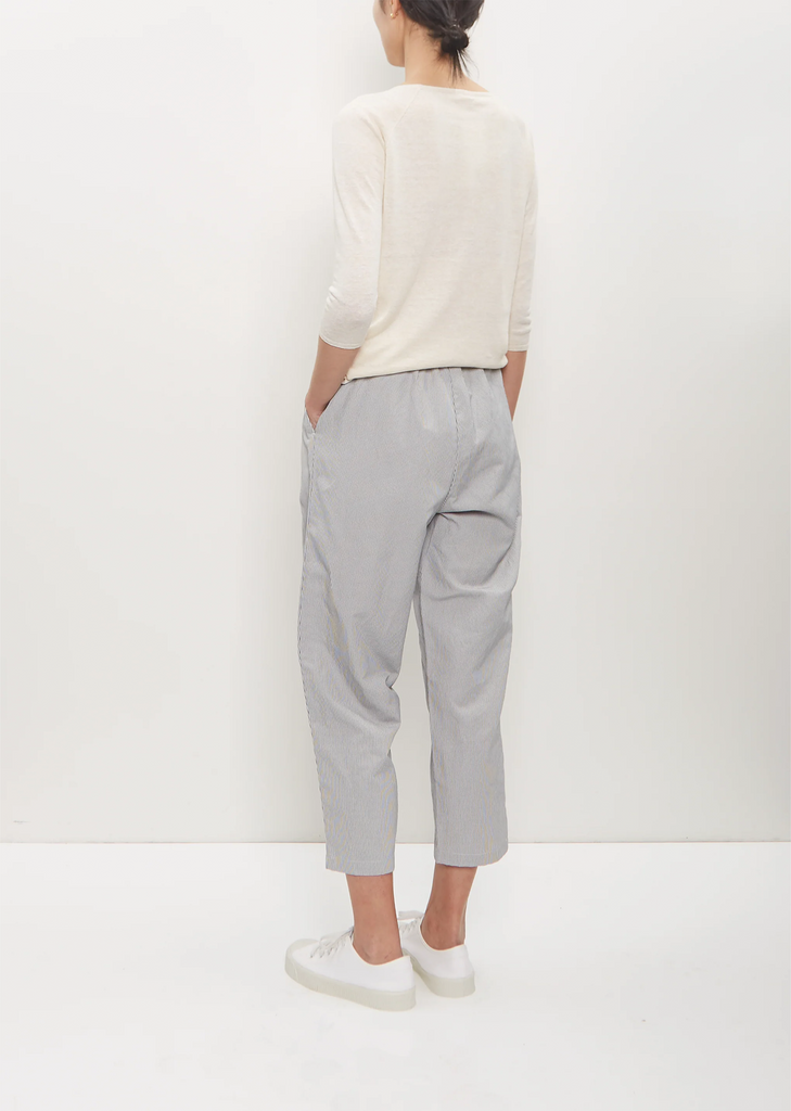 Apuntob cement grey and white striped cropped pull-on pant with a slightly tapered leg and pleats at front in linen blend crepe. Features an elasticated waistline and concealed side seam pockets. Unlined.