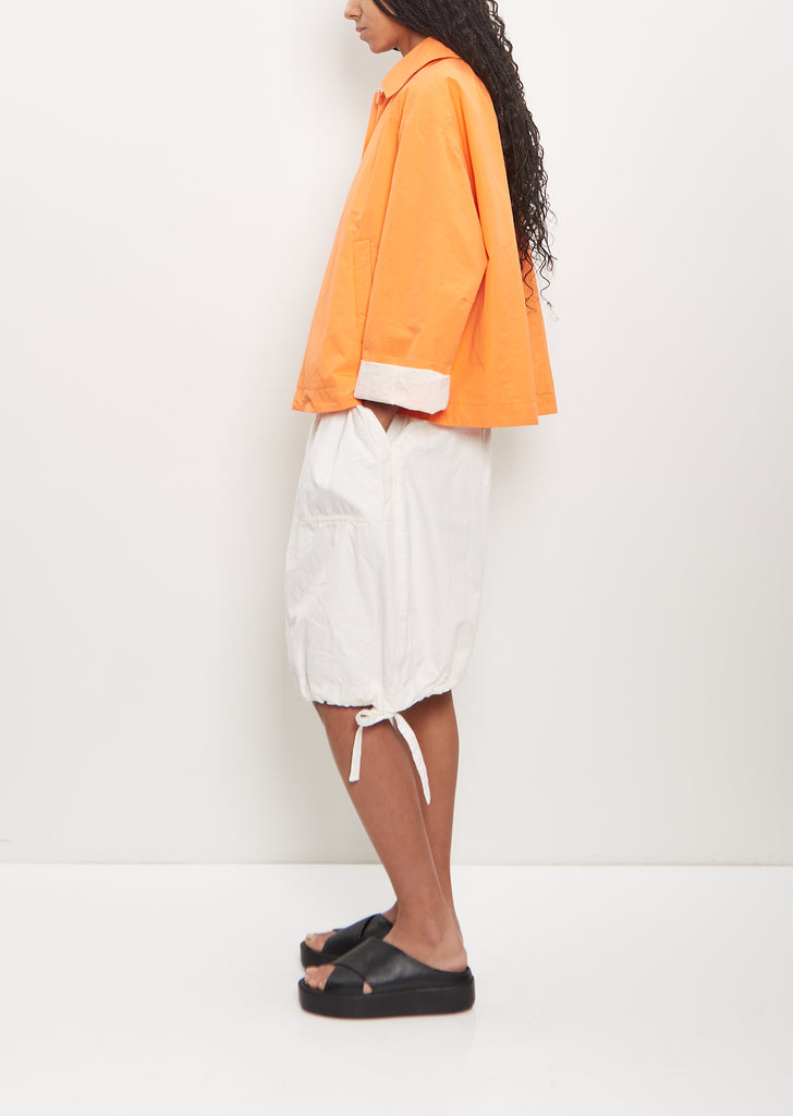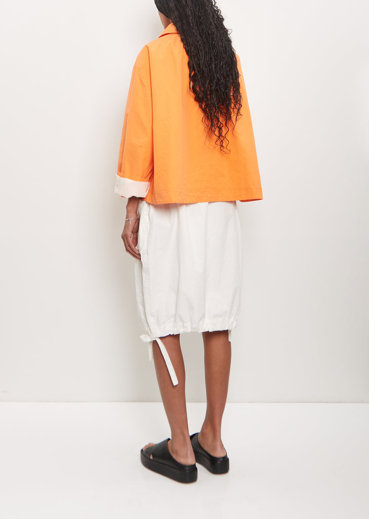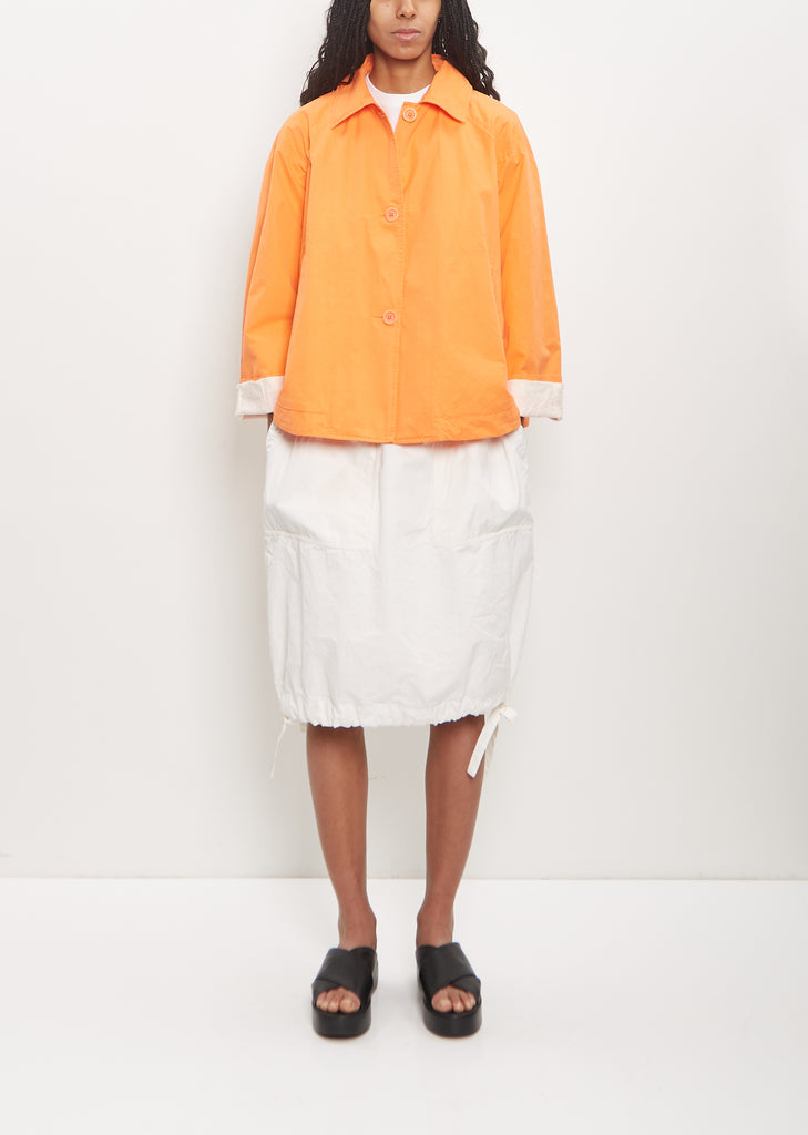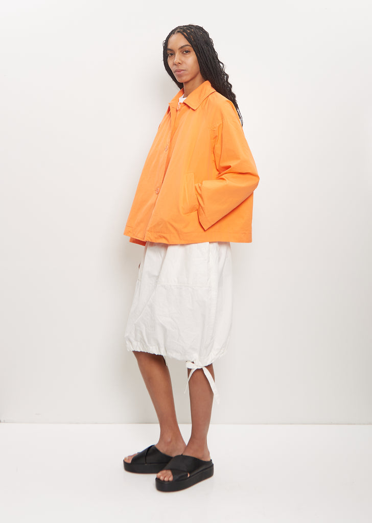 Casey Casey pumpkin orange jacket with tonal corozo button closure in washed cotton with a subtle texture. Features a spread collar, raglan straight sleeves, and angled side pockets. Relaxed fit. Fully lined in ivory cotton.
