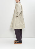 Casey Casey concrete beige long coat with spread collar and tonal corozo button front in technical paper cotton. Features dropped shoulders, dolman sleeves, and vertical side welt pockets. Lined in tonal self fabric.