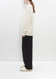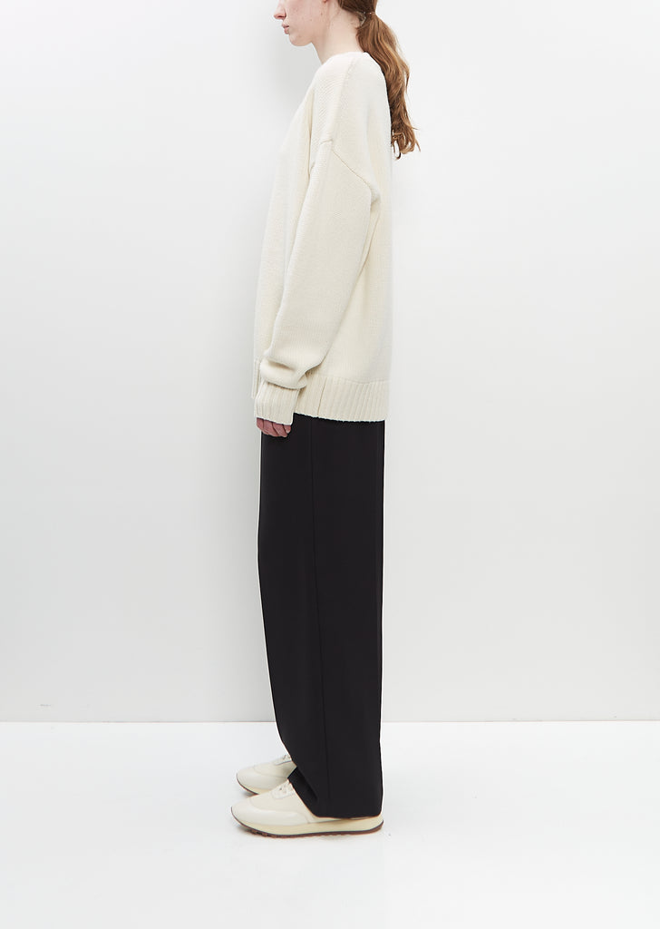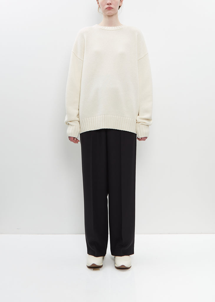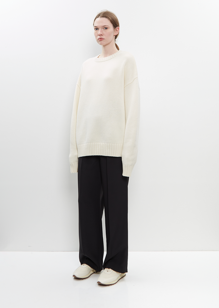 Extreme Cashmere cream crewneck sweater with elongated sleeves in heavyweight cashmere knit. Features dropped shoulders and ribbed trim at neckline, cuffs, and hem. Relaxed fit.