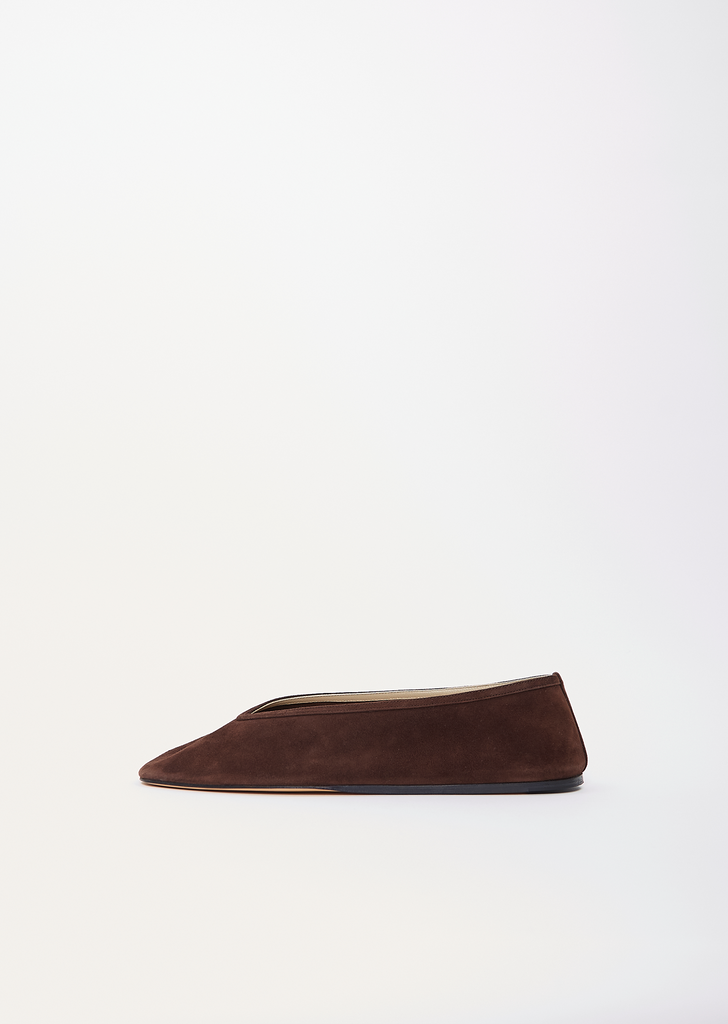 Le Monde Béryl chocolate brown slipper with an almond toe and piped trim in soft suede leather. Features a cushioned calf leather insole, a leather sole and rubber heel.