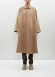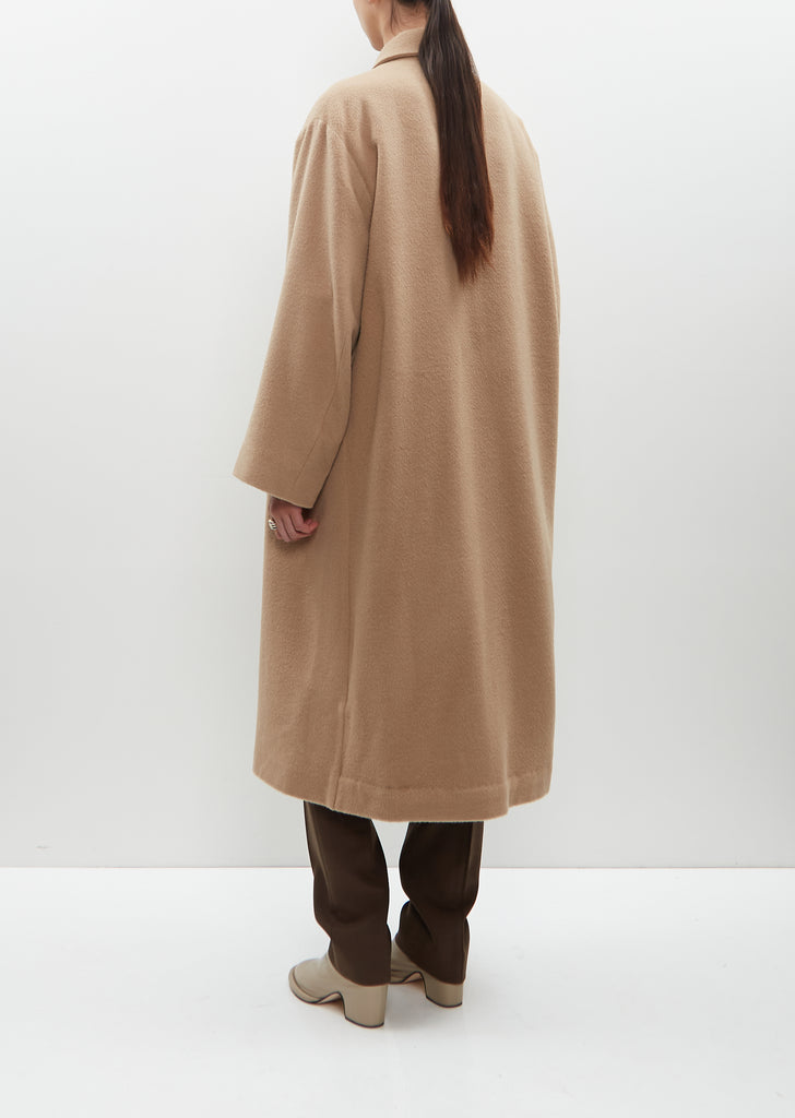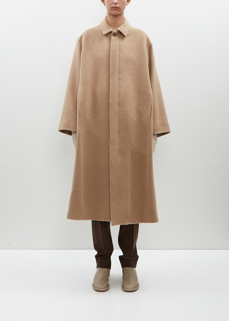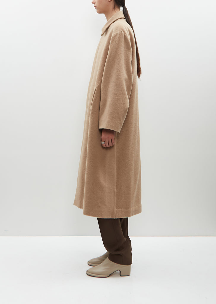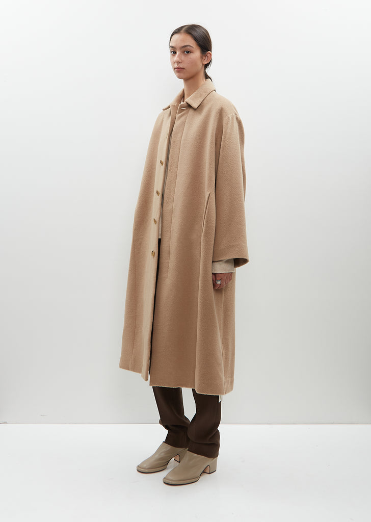 Lauren Manoogian camel coat with a spread collar and concealed button placket closure in soft baby alpaca and wool blend with pile texture. Features a single exposed button at neck, side seam pockets, and back vent. Lined in beige cotton fabric.