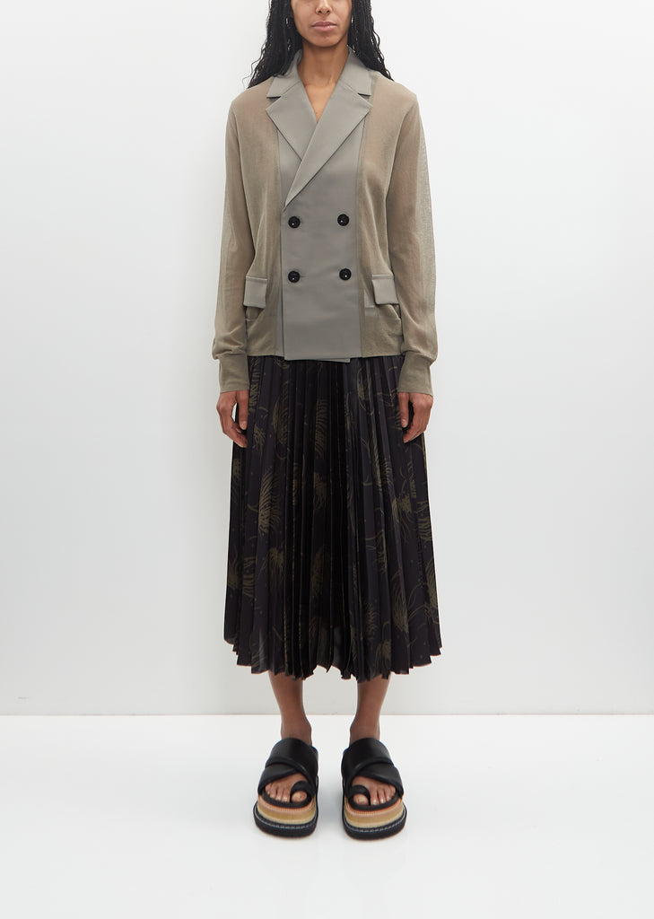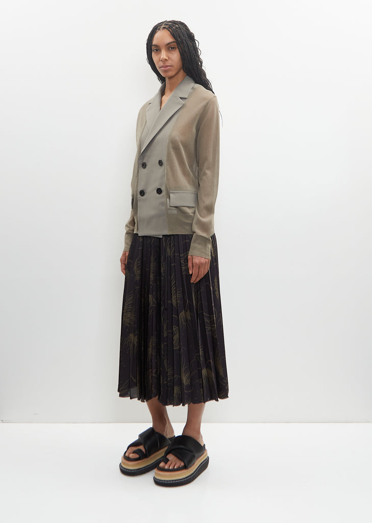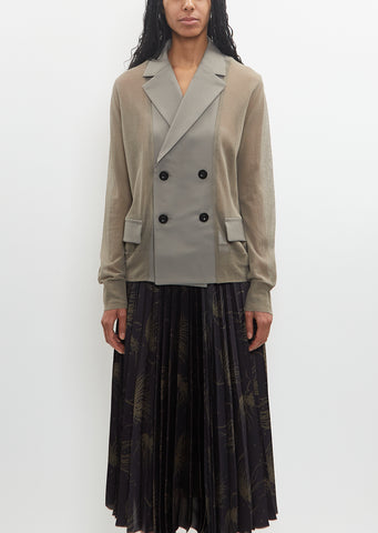 Sacai taupe khaki paneled double-breasted blazer with cotton and poly blend twill notched collar and placket in poly-wool sheer knit. Features flap pockets at front and rib trim finishings at cuffs and hem. Finished with contrasting black buttons.