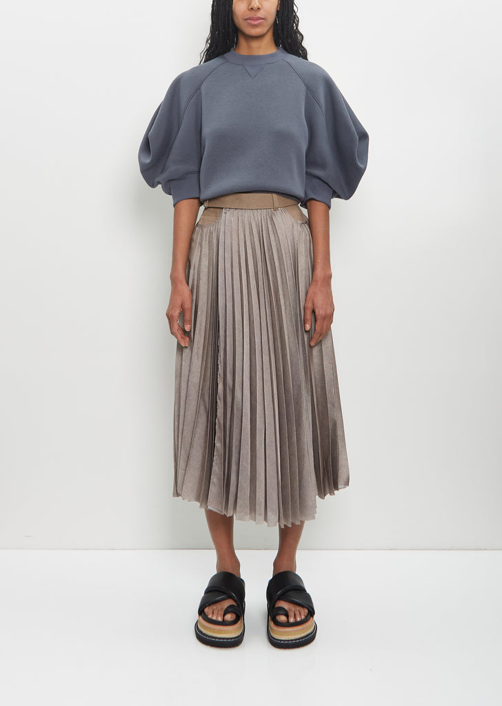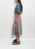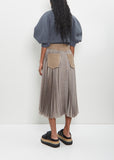Sacai dark beige A-line wrap pleated skirt with denim details and a 5-pocket construction in poly twill with a denim print. Features an adjustable self belt with rectangular ring, an interior side button closure and belt loops. Partially lined in tonal cupro.