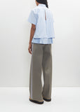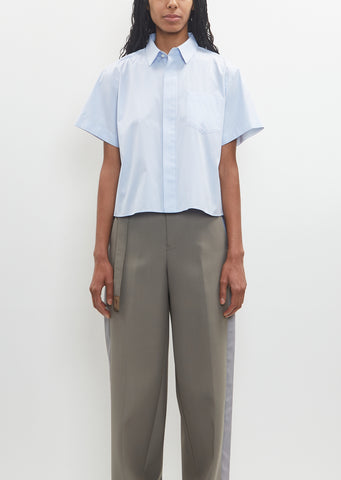 Sacai light blue stripes layered short sleeve shirt with a pleated panel at back and a high slit at back center in cotton poplin. Features a spread collar, a single patch pocket at chest, yoke detail at back and nacre-hued buttons closure at front. Straight fit.