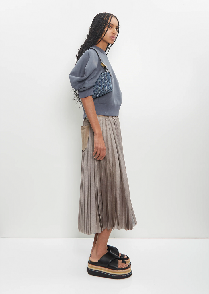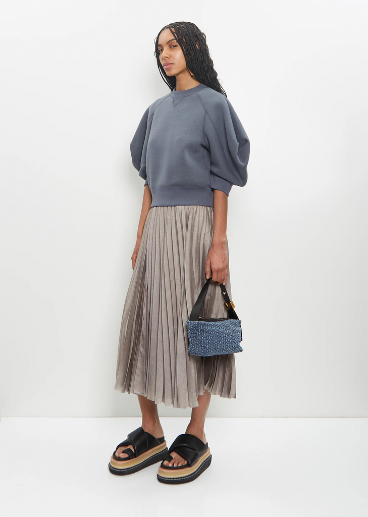 Sacai indigo small shoulder bag with adjustable leather strap in cotton denim tweed. Features a top zip closure, gold-toned hardware and an interior slip pocket. Lines in black cotton fabric.