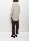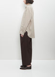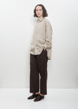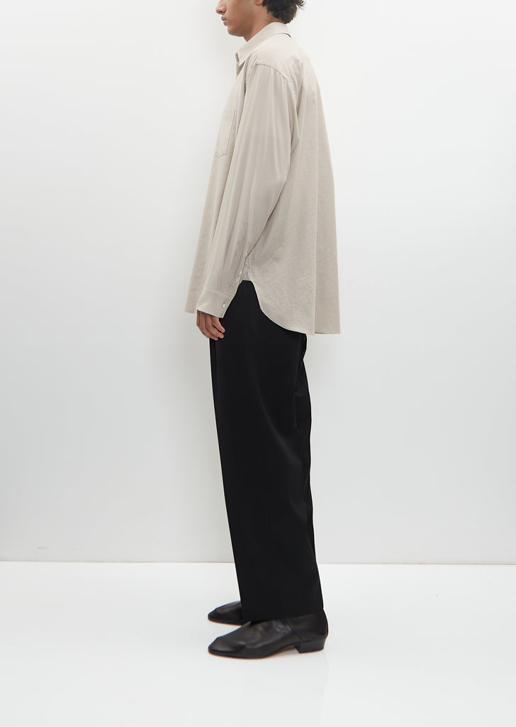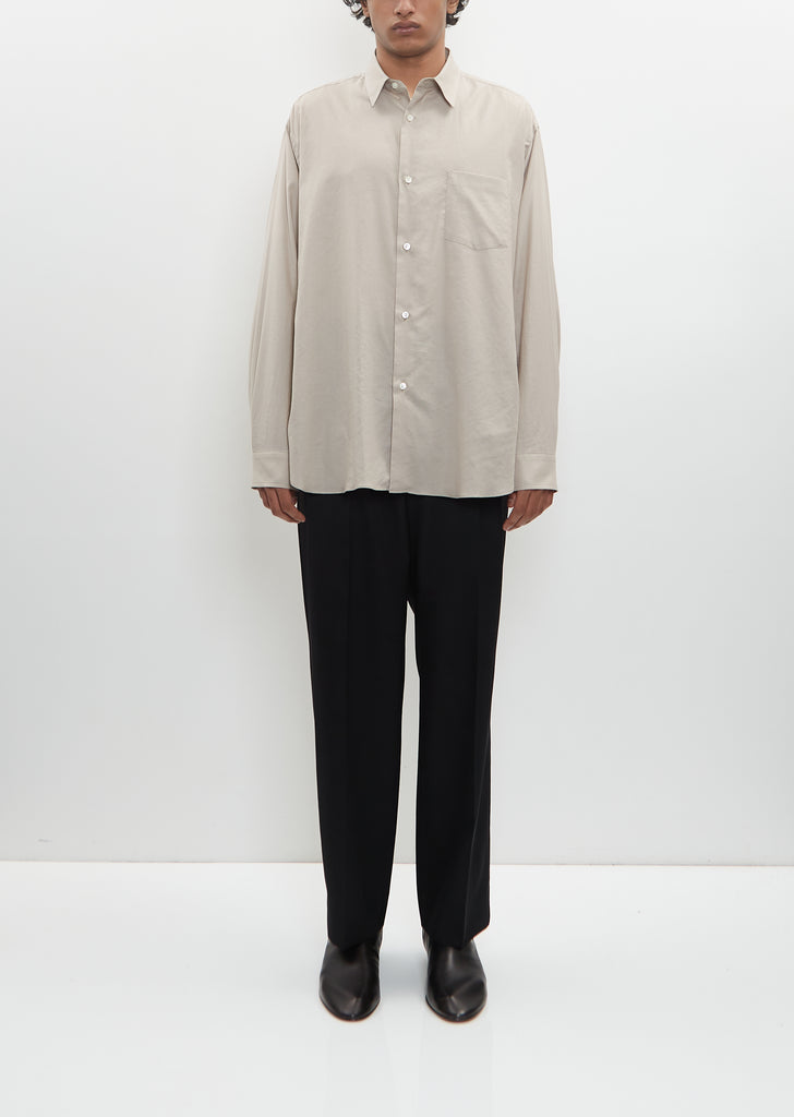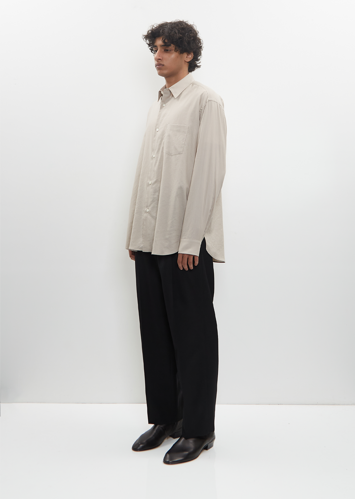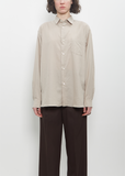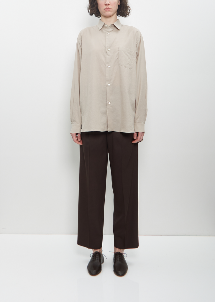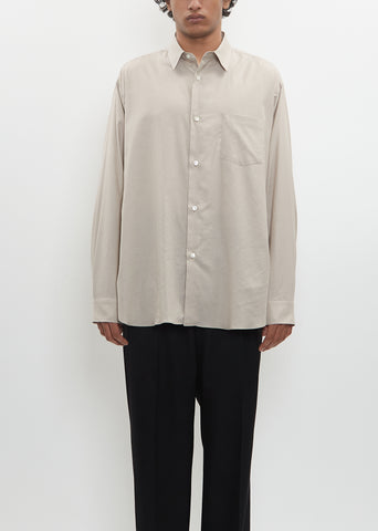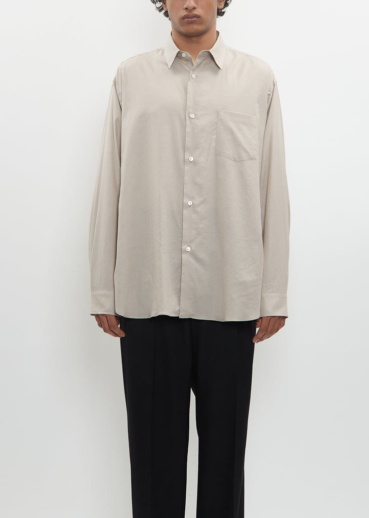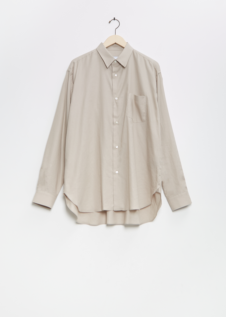 Stein greige oversized shirt with regular collar and shell-hued button front in a soft cotton silk blend fabric. Features chest patch pocket, buttoned cuffs, curved hem with split sides, and single box pleat at back yoke.