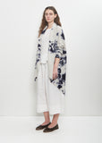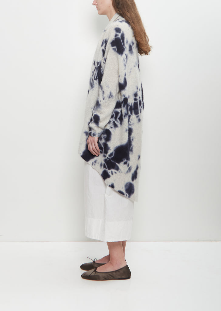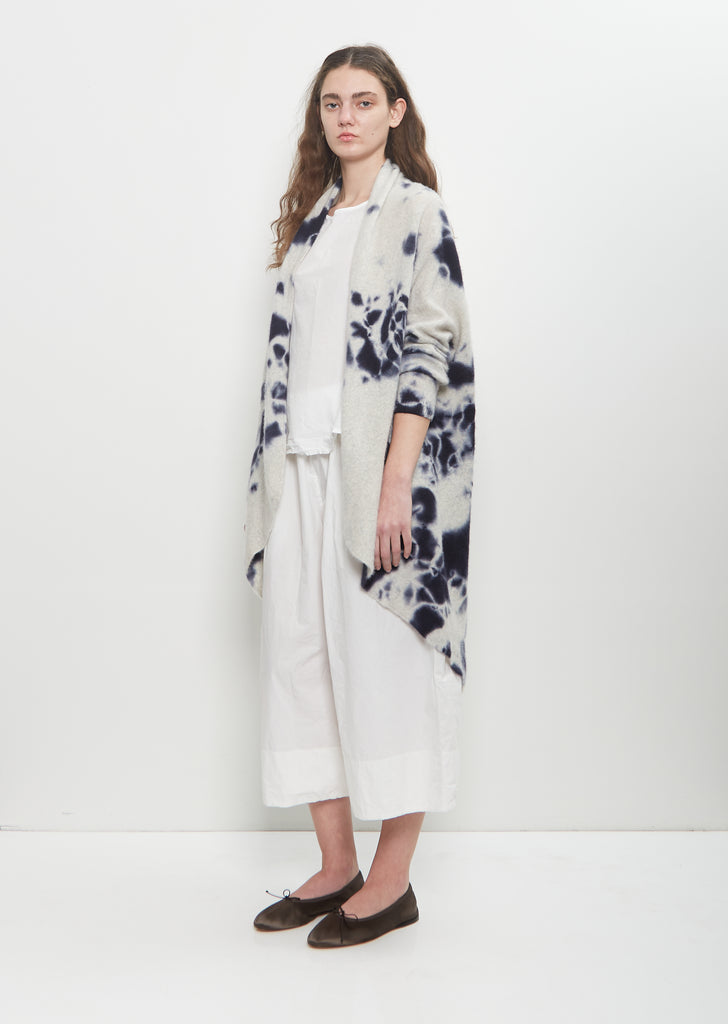 Suzusan black and light grey open front cardigan with a shawl collar in mid-weight pure cashmere knit with a traditional Shibori pattern. Features dropped shoulders and an angled bottom hem.