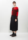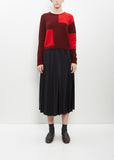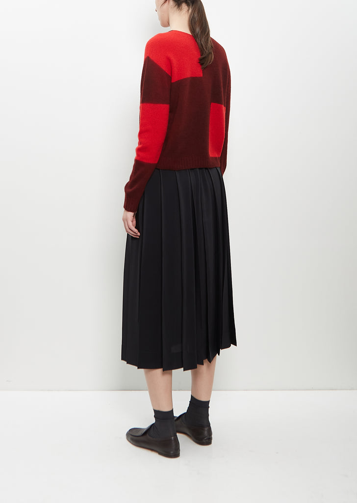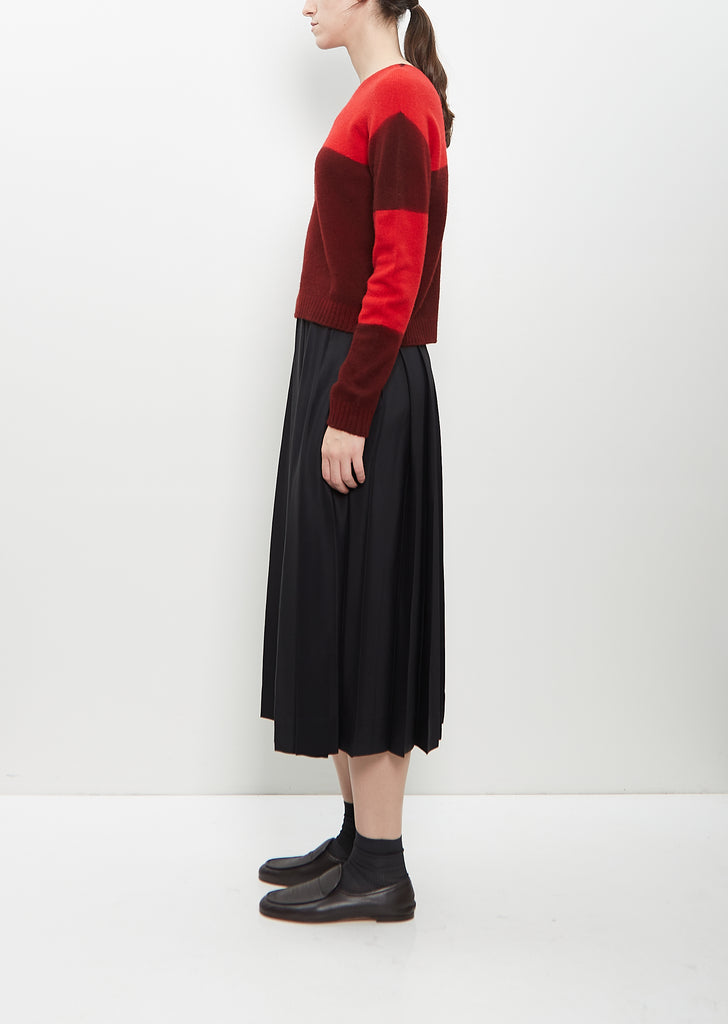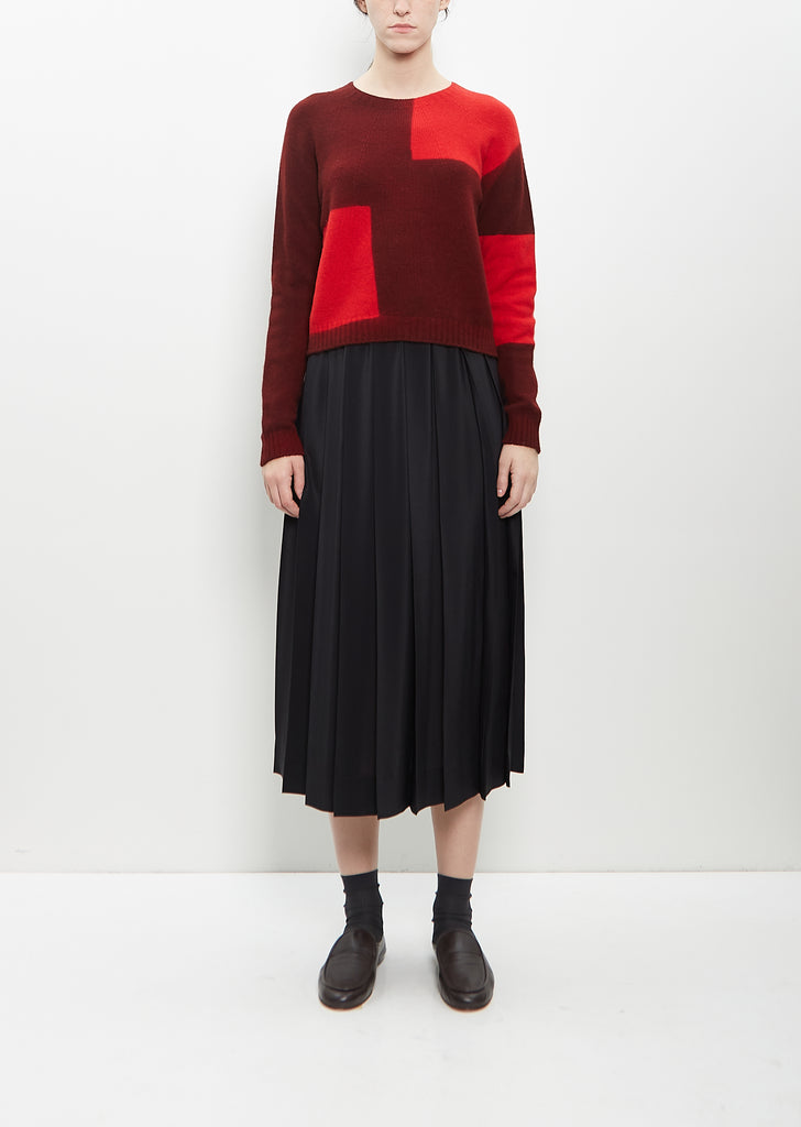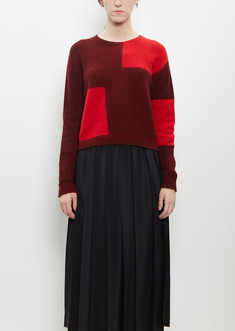 Suzusan burgundy and red cropped sweater with round neckline and raglan sleeves in mid-weight pure cashmere knit with a traditional Shibori pattern. Features rib trim finishings at neckline, cuffs, and hem. Regular fit.