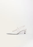 Totême off white slingback heels with pointed toe and a slanted heel in patent leather. Features a mid-vamp band and elasticated back strap.