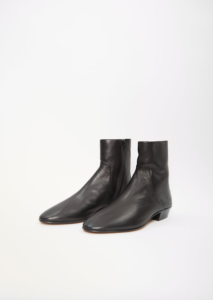 The Row black ankle boot with elongated almond toe and tonal interior zipper closure in smooth nappa leather. Features leather sole and stacked heel.