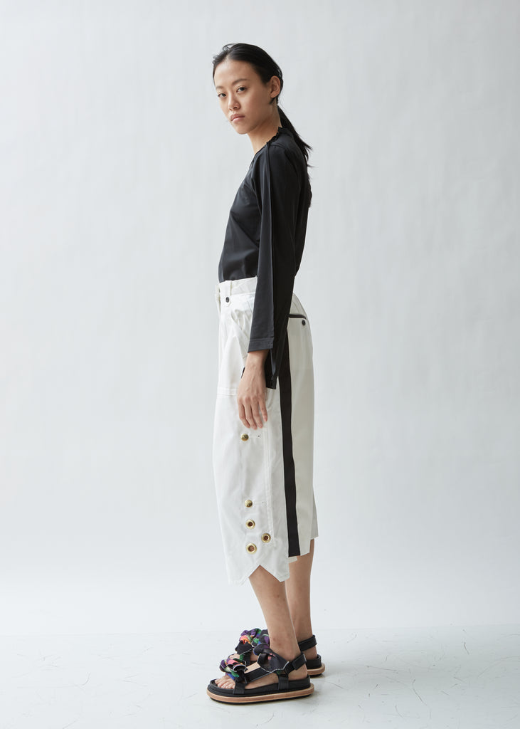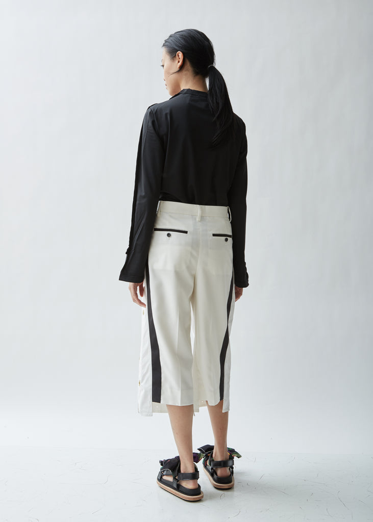 From the runway collection: White gabardine and poplin cropped pants. Loose, wide leg fit. Four pocket styling with twisted front pocketing. Oversized gold-tone hardware and eyelets. Pleating in front. Split details at the cuffs. Black grosgrain trim. Zipper fly, hook/eye closure. Color: White. 100% Cotton; Attached Parts: 50% Wool, 50% Polyester. Made in Japan.