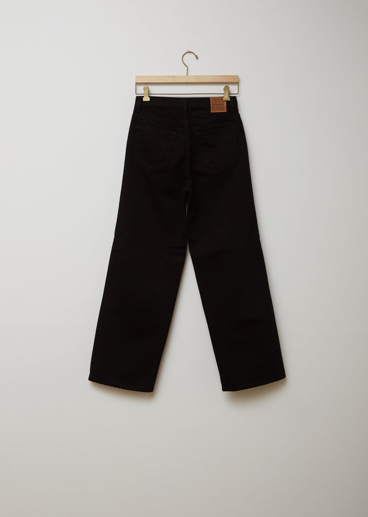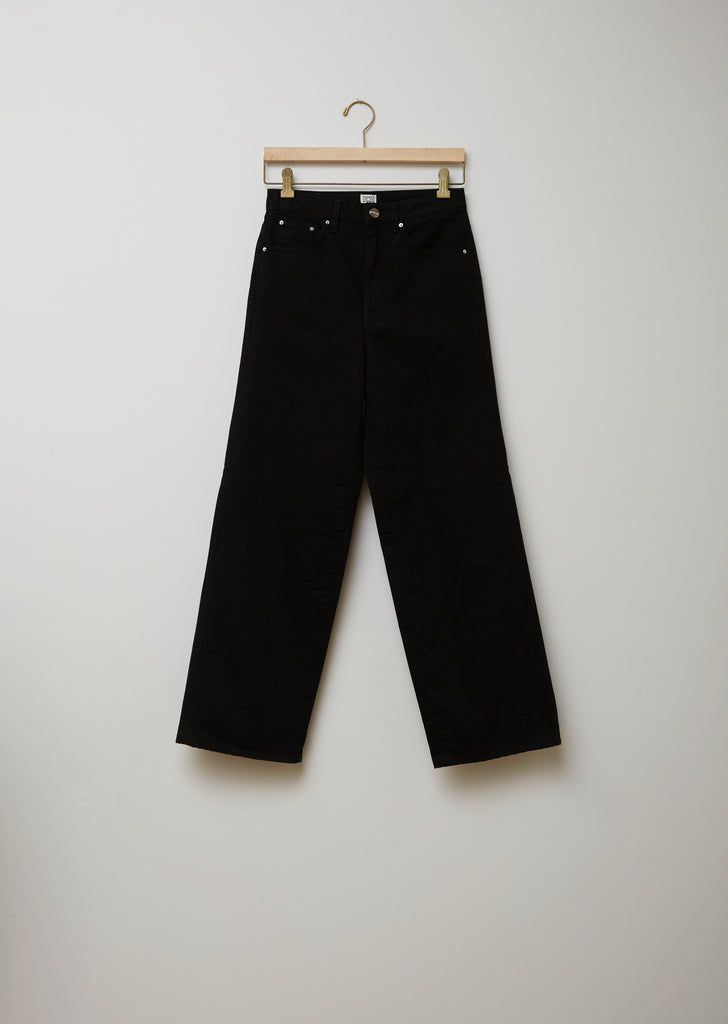 High-rise wide-leg jeans featuring an ankle length and traditional five-pocket styling, rendered in non-stretch black denim. Belt loops. Debossed brown leather logo patch at back waist. Button/zip-fly front closure; logo-engraved button. Silver-tone metal hardware throughout. Ankle length. Relaxed fit.
