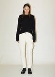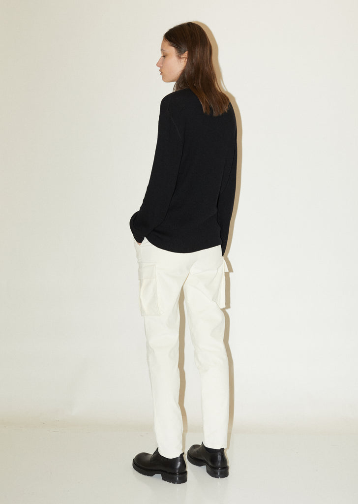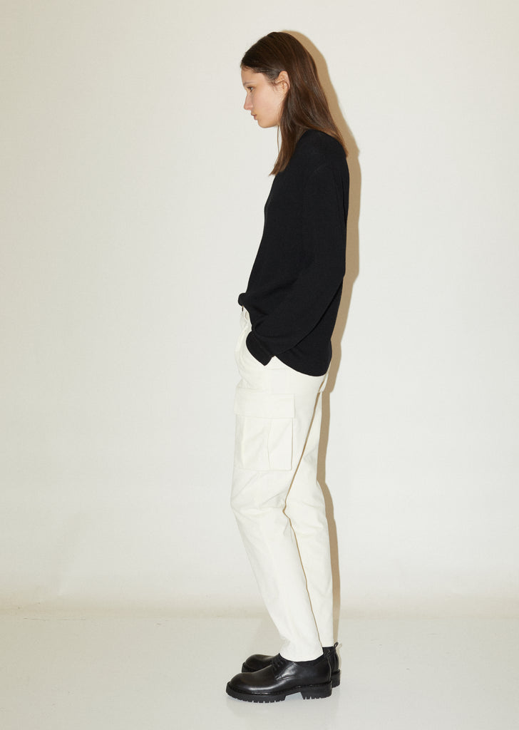 Soft white corduroy slim trousers with classic cargo styling. Mid-rise. Set-on waistband. Belt loops. Darting at back waist. Zip fly. Horn-button closure. Quarter-top pockets. Jetted back pockets. Inverted-box-pleated cargo pockets at sides of thighs. Paneled knees. Slim fit.