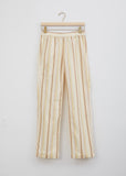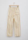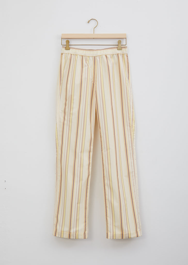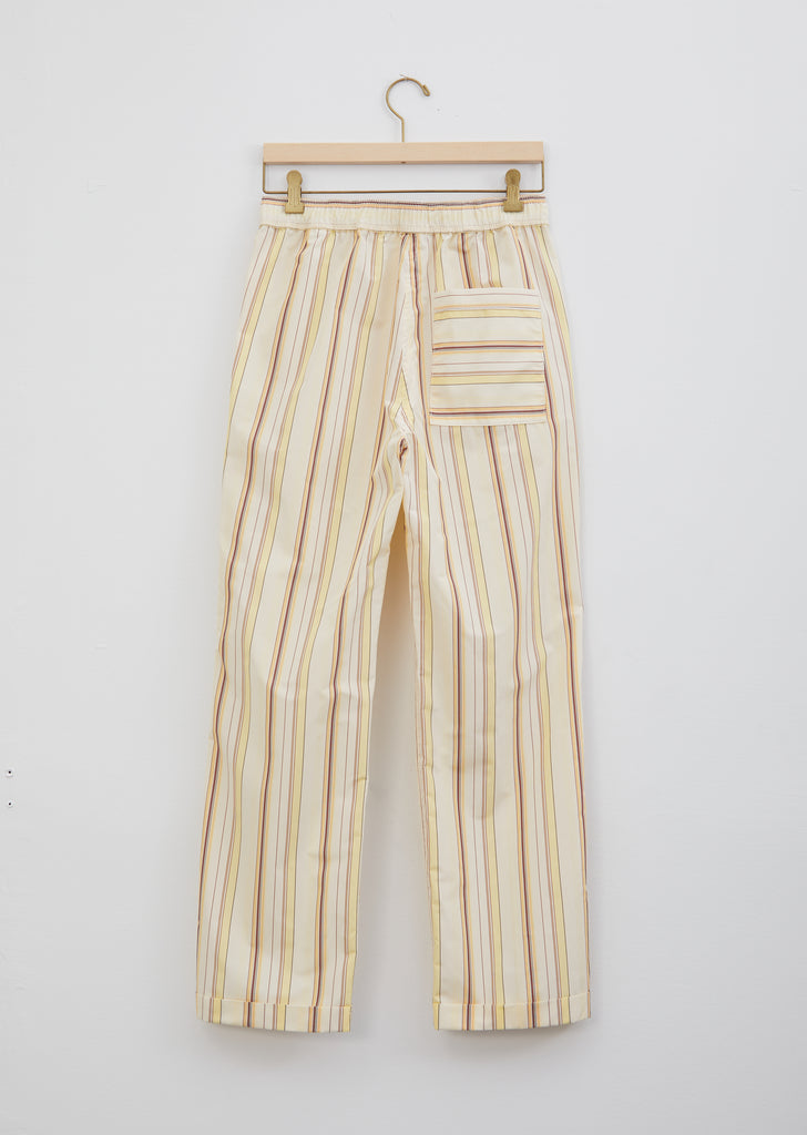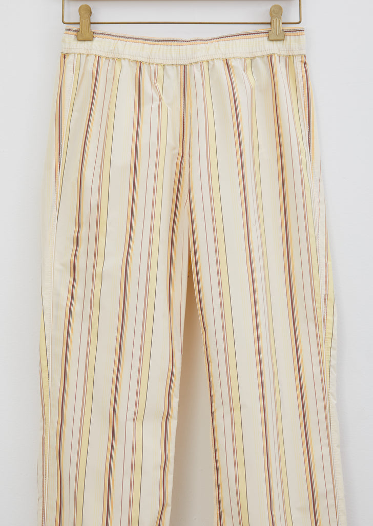 Wales Bonner Pyjama Pants in pale yellow & tobacco. Crafted in a polyester and cotton blend ripstop fabric that is lightweight with a hint of sheen, this signature trouser style by the label features a straight wide-leg and patch pocket detail at back with opposite direction stripes.