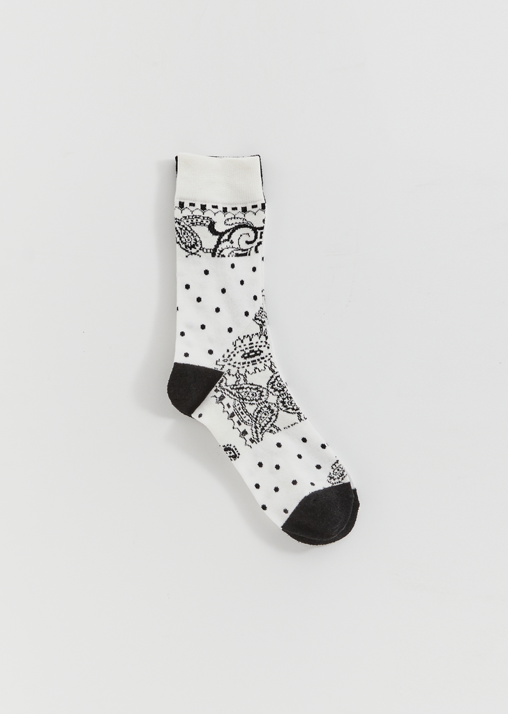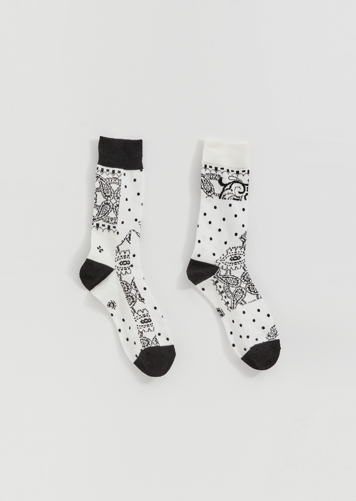 Sacai Paisley Socks in black & white. Signature asymmetrical socks with paisley pattern on a white background and varying pattern on each side.