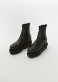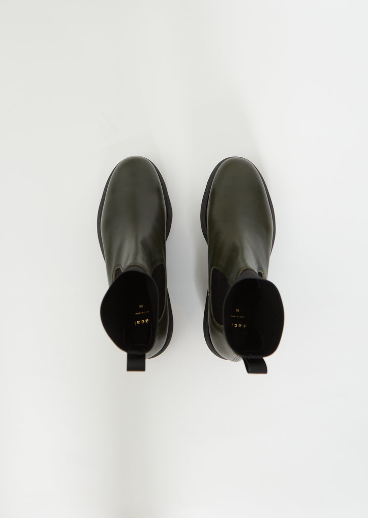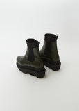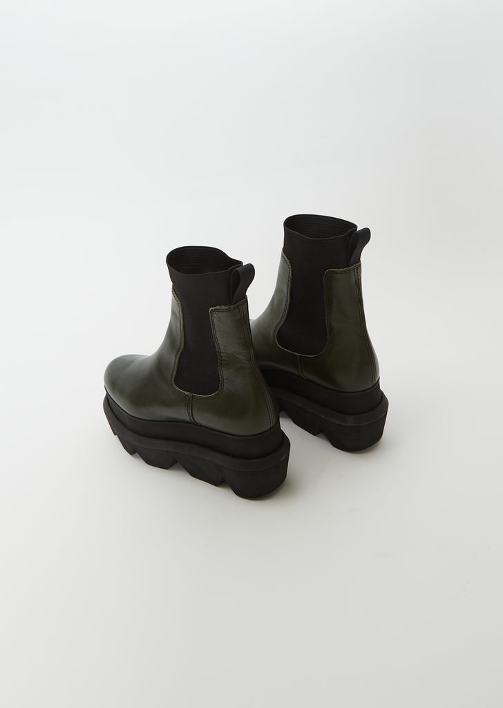 Sacai platform Chelsea boots in dark khaki. Features a contrast black elasticated gusset at sides and ankle cuff on a black treaded rubber platform.