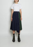 Sacai two-tone navy and green accordion pleated skirt with asymmetrical hem and decorative exposed silver-tone zipper at front and back panels cut from a cotton and polyester blend technical fabric. Concealed side zipper fastening.