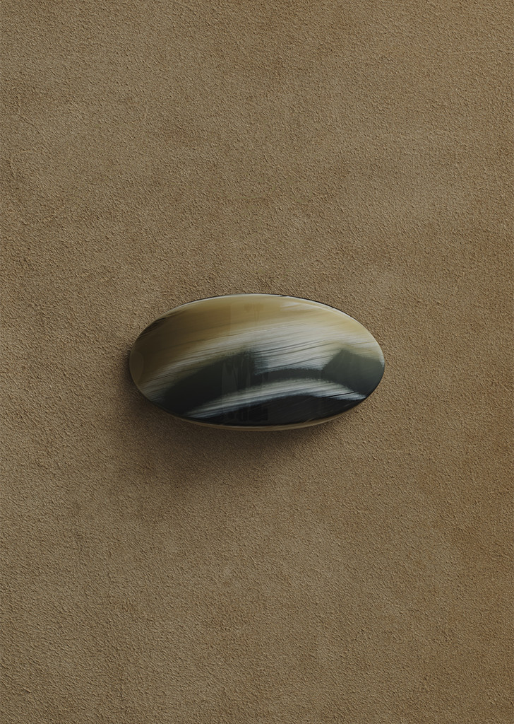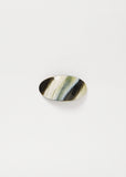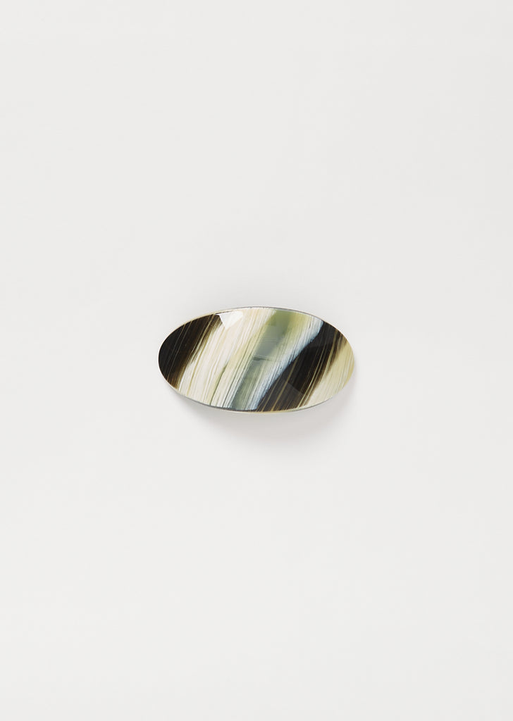 An oval shaped hair clip featuring a stainless steel French barrette. Made from acetate.