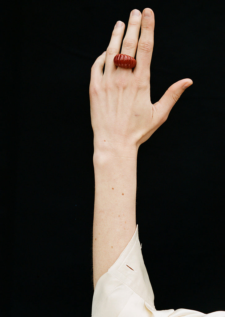 Sophie Buhai sculptural ring with ridges reminiscent of a shell, handcrafted in red jasper stone.