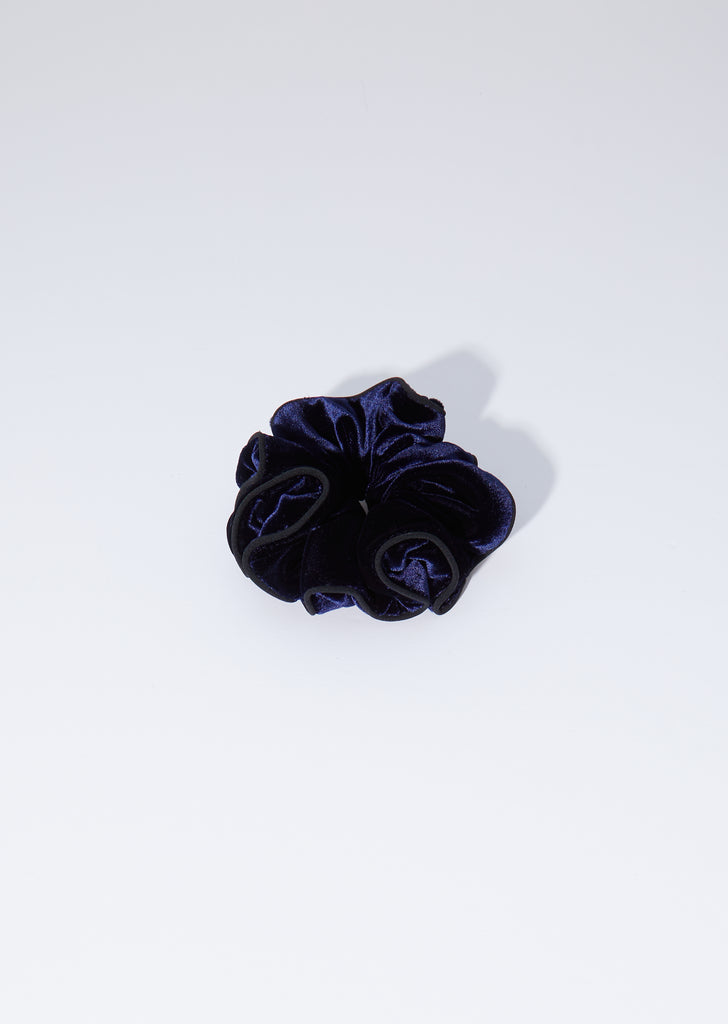FW'20 Collection — Sophie Buhai Montaigne Scrunchie in Navy. Decorative hair scrunchie made from silk velvet with contrast black piping.