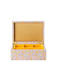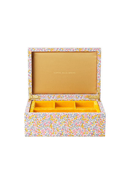 Sophie Bille Brahe larger jewelry box featuring a removable top tray with four compartments providing space for organizing and keeping jewelry separated. Crafted in cotton Liberty fabric featuring a canary yellow contrast interior.