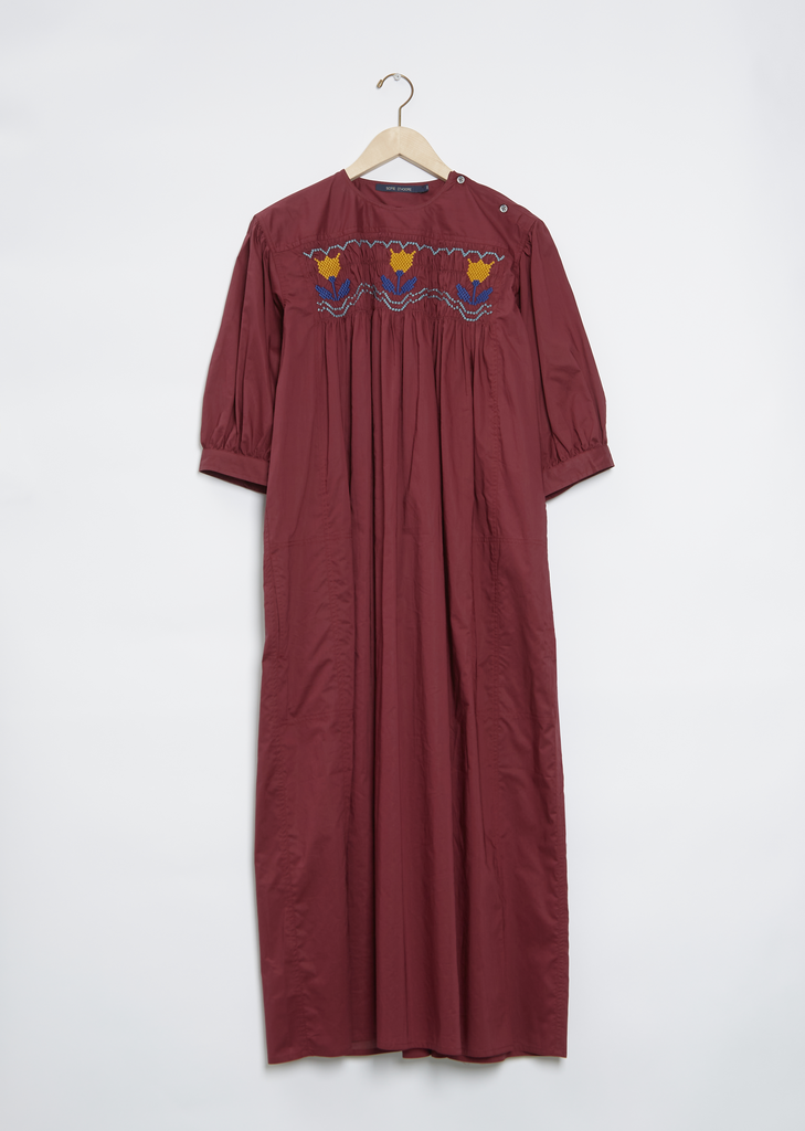 Sofie D'Hoore mahogany red a-line smock dress with blue and yellow floral embroidery and smocking panel in a lightweight cotton voile.