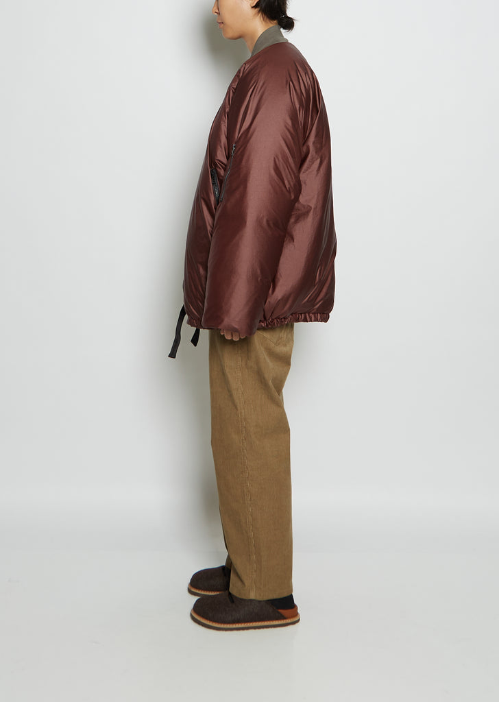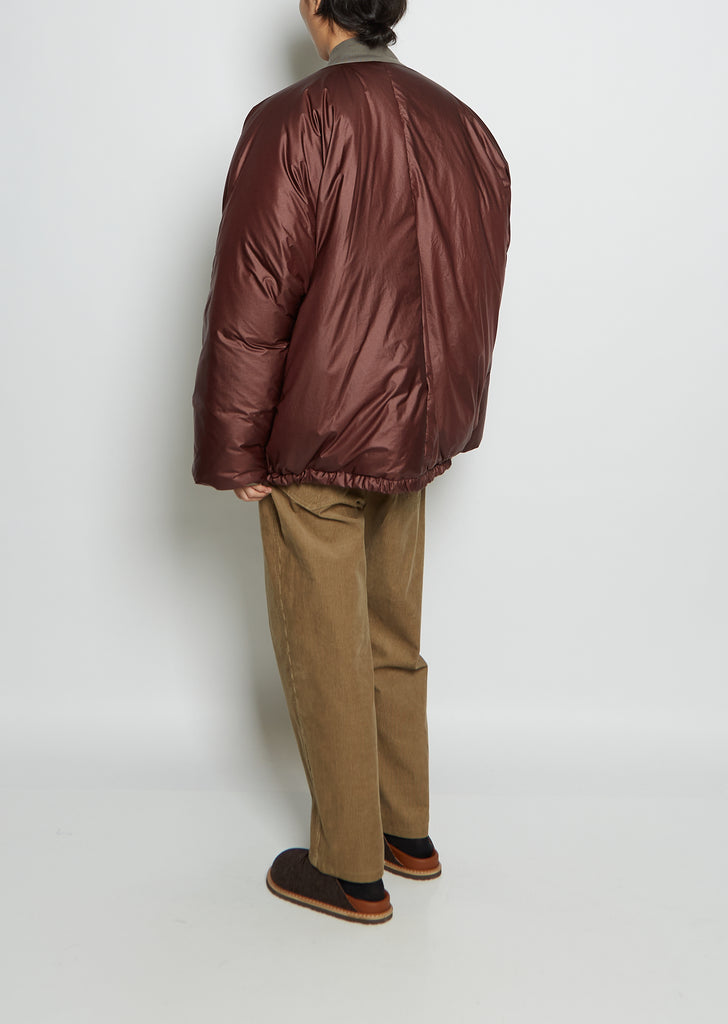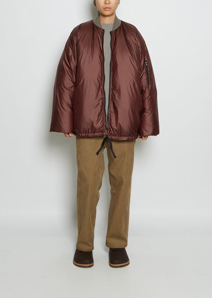 Sofie D'Hoore reversible bomber jacket with a grey rib knit collar made from a quilted chocolate brown polyamide outer shell and feather down fill. Features a two-way matte black zipper, front zip pockets and a grosgrain drawcord at the bottom hem.