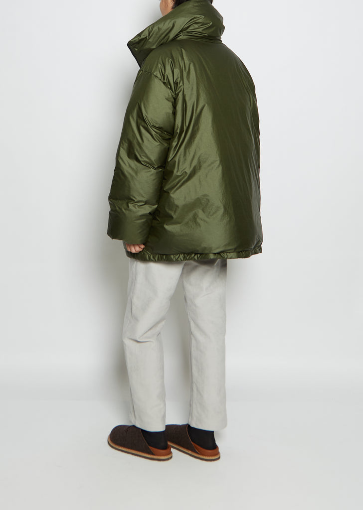 Sofie D'Hoore khaki green puffer jacket with a tall collar made with a polyamide outer shell and feather down fill. Features a two-way matte black zipper, front welt pockets and a grosgrain drawcord at the bottom hem.