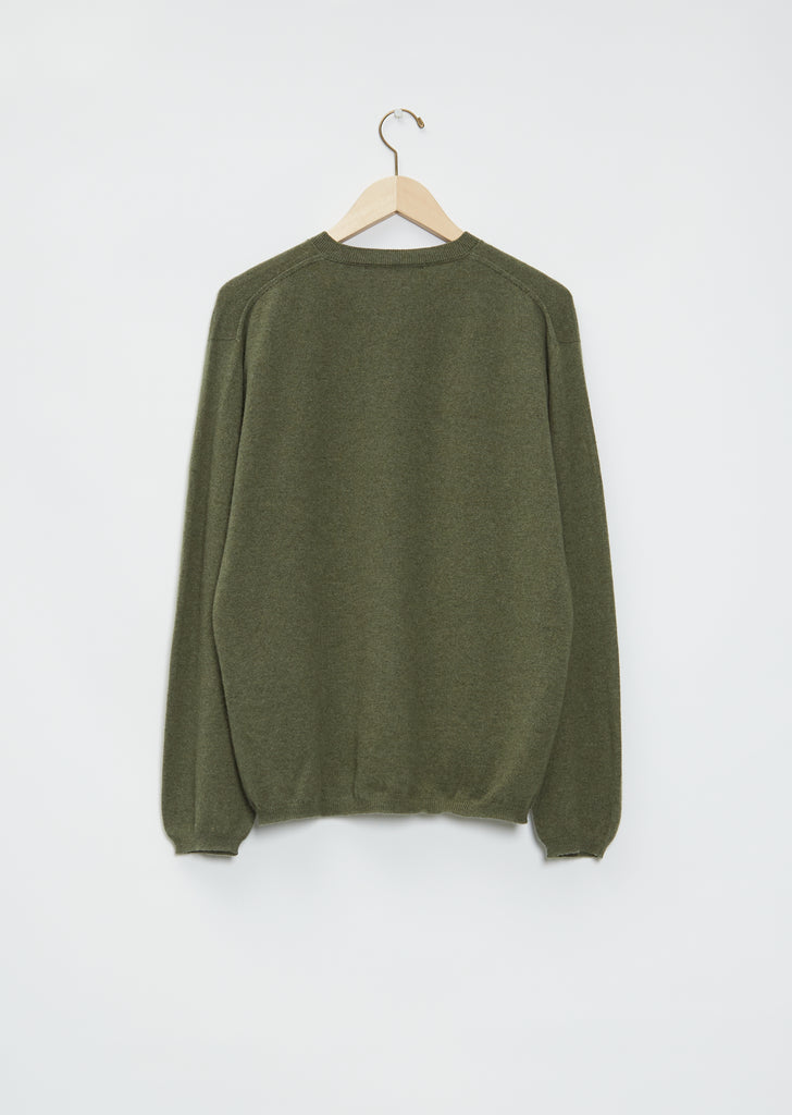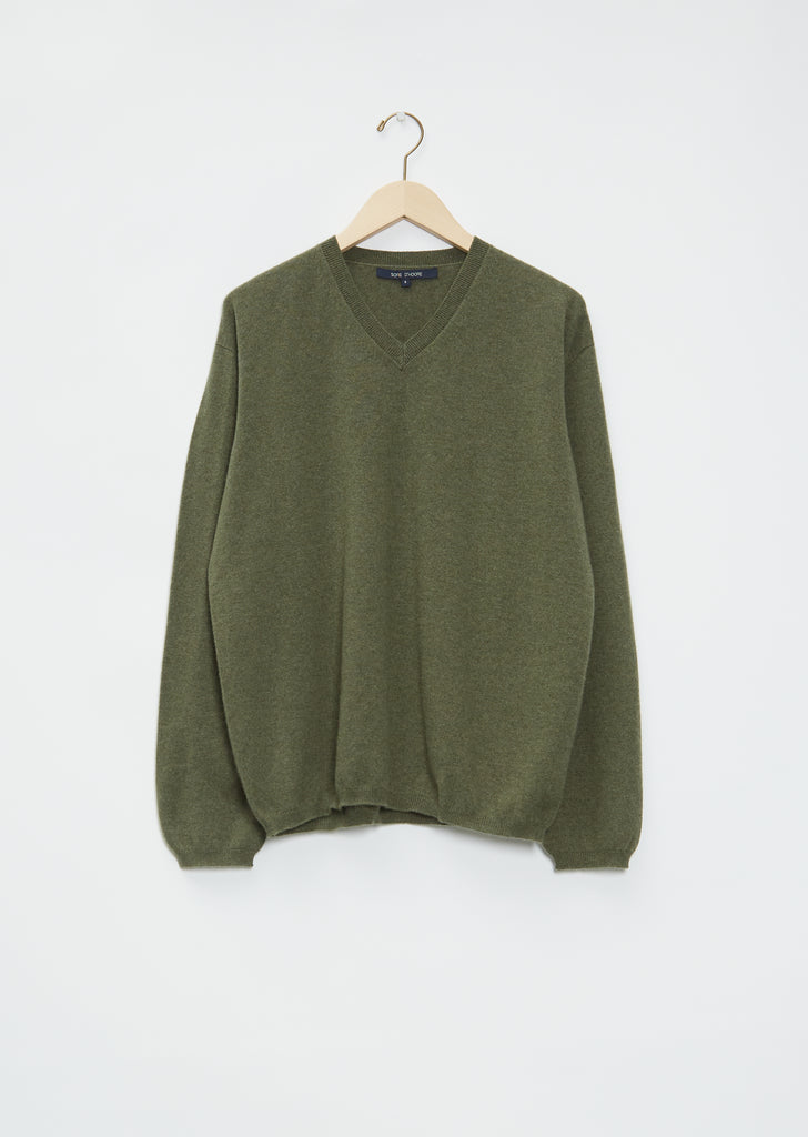 Sofie D'Hoore military green v-neck menswear sweater with a cocoon shaped body in a cashmere knit.