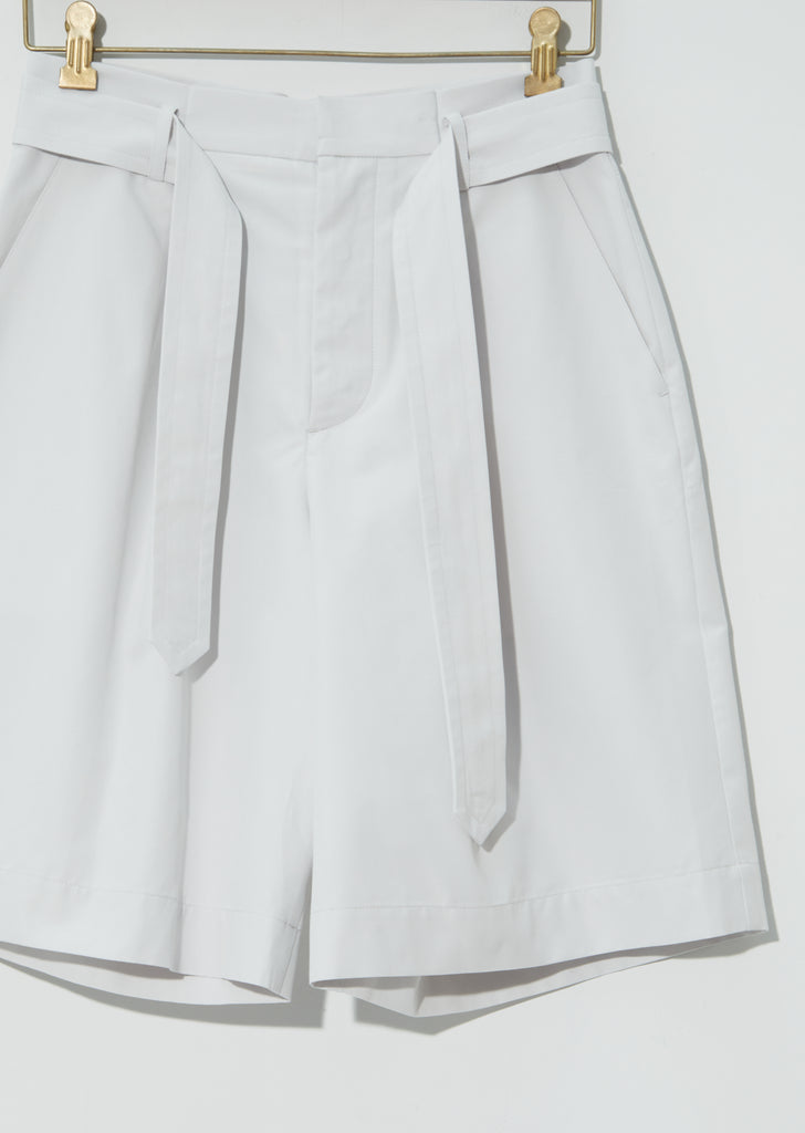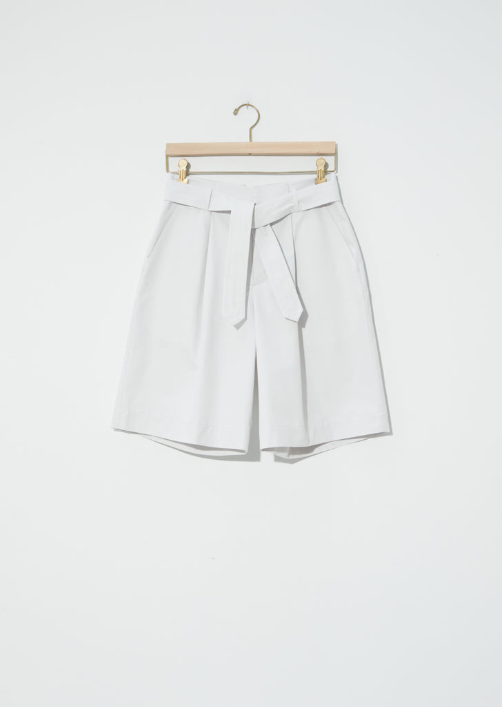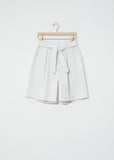 Seya pale grey shorts with self belt in cotton. Slash side pockets and double patch pockets at below back yoke for flattering fit. Subtle paper-bag waist with a relaxed fit.