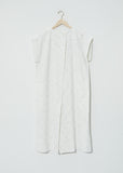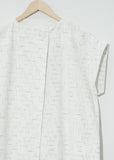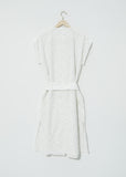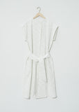 Seya tunic dress with rolled wide set sleeves in woven cotton with all over line pattern in indigo over a soft white background. Angled front panel with snap closures and finished with beige-toned exposed button at neckline that can be worn open. Comes with a self belt to cinch at waist without any belt loops. Concealed side seam pockets. Unlined. Loose, slightly oversized fit.
