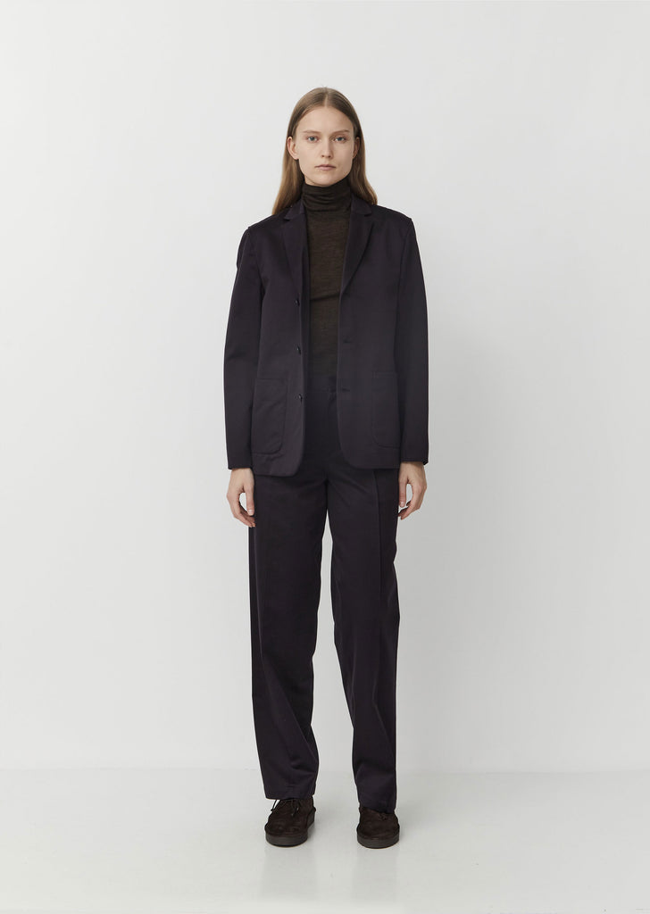Seya signature single-breasted blazer in a dark indigo. Straight-cut jacket with three-button closure. Small notch collar and curved front panels with rounded patch pockets. Seam-binding finish at interior. Unlined.