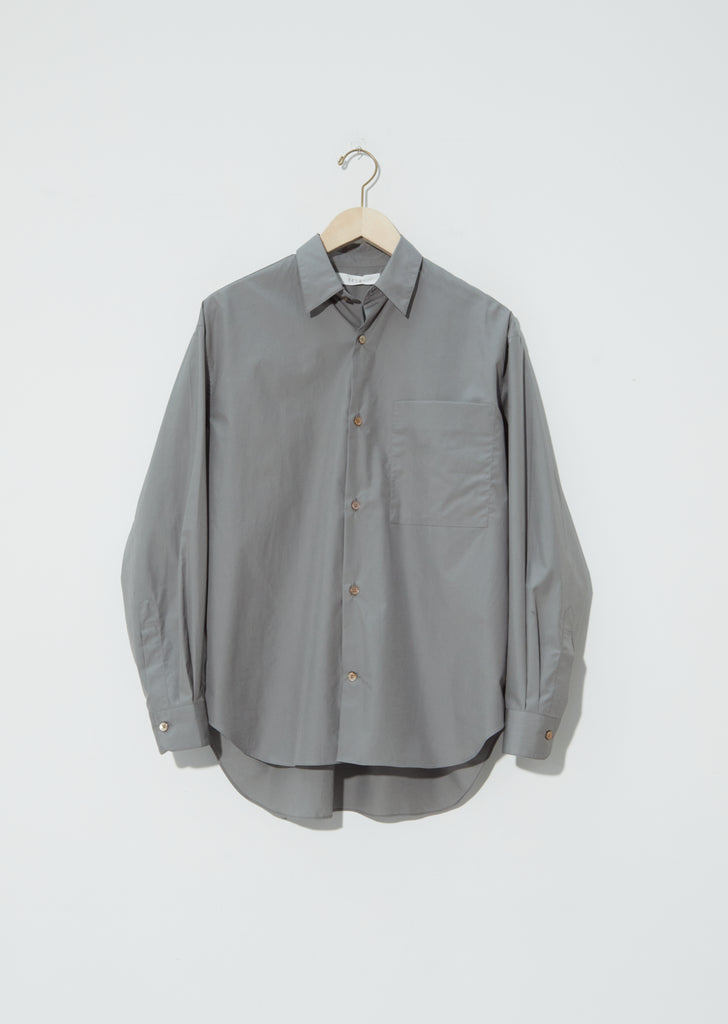 Seya classic button up shirt in grey in refined cotton poplin featuring a single chest pocket and cuffed sleeves with tuck detailing. Shirttail hem with longer back. Straight silhouette with a relaxed fit.