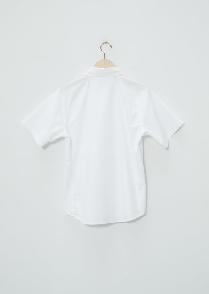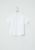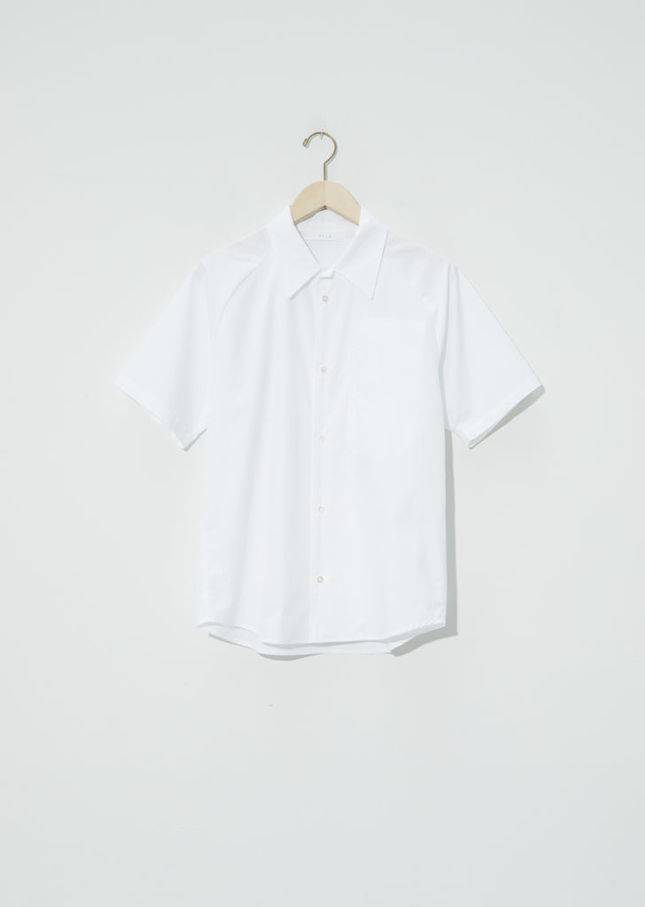 Seya signature short sleeve button up in light cotton poplin featuring raglan sleeves and hidden patch pocket with side welt detail. Subtle shirttail hem. Slight narrow cut with a relaxed fit.