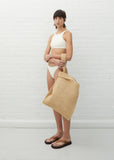 Seya signature hand–woven square-shaped shopper in natural-tone crafted in raffia with double self handles. Flat tote expands with side folded gussets. Single pocket at interior. Handmade by artisans in Madagascar; each piece varies slightly.
