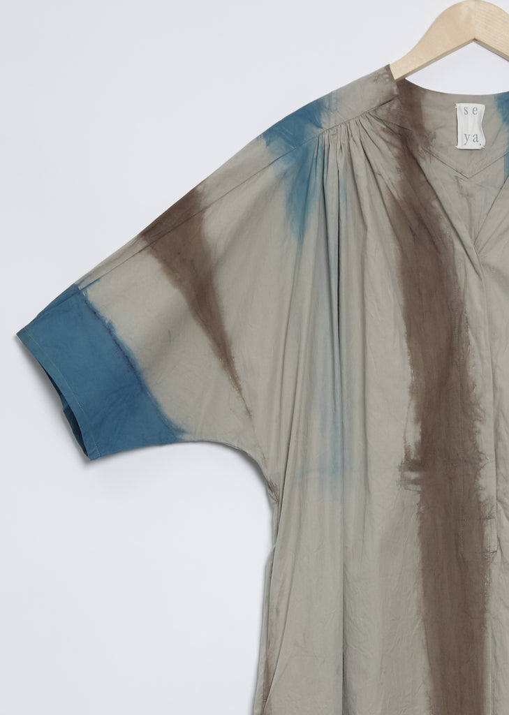 Seya indigo, taupe and brown hand dyed dolman sleeve v-neck tunic dress with shirring detail at the shoulder in a lightweight printed silk cotton poplin.