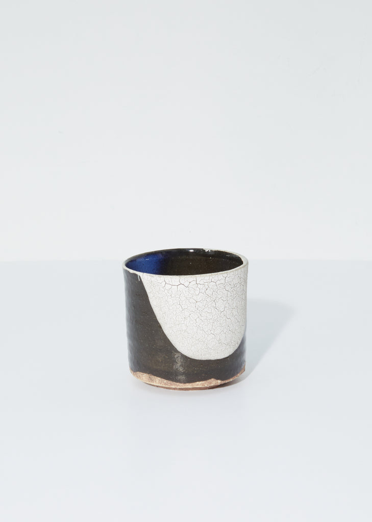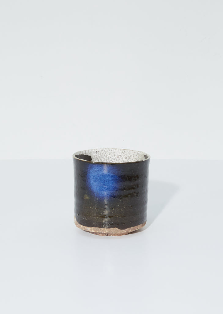 Seya artisanal mug handmade in Japan in the style of Japanese Mino ware – an ancient method dating back more than 1300 years. The earthenware mug features a mixture of glazed, textured and cracked impressions in tones of blue, brown and white.