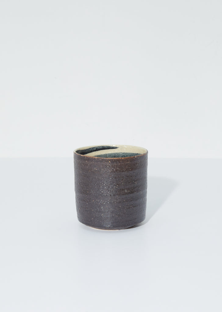 Seya artisanal mug handmade in Japan in the style of Japanese Mino ware – an ancient method dating back more than 1300 years. The earthenware mug features a mixture of glazed, textured and cracked impressions in tones of black and brown.