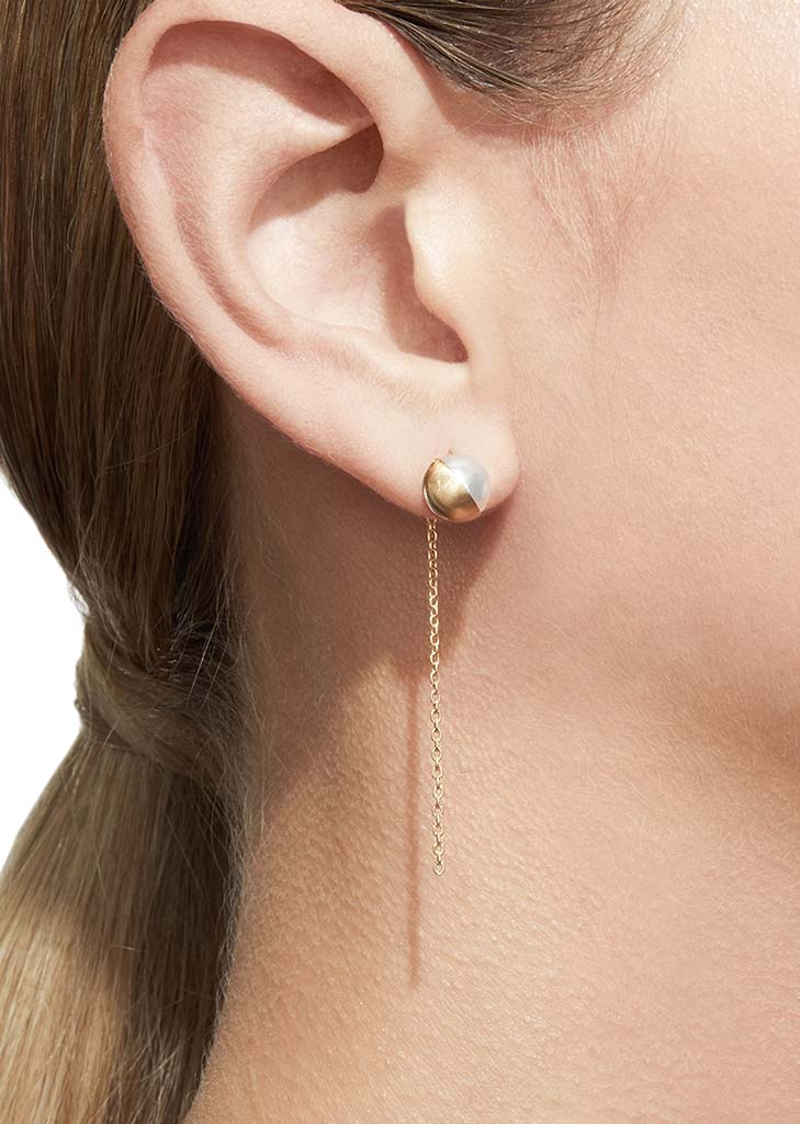 A pearl is encased in a half sphere of gold at a 135 degree angle and attached to a chain. The end of the chain is soldered to create a post and is homogenous once worn. You can play with the pearl placement by choosing how much of the chain to slide through. Comes with 2 silicone backs. This item is sold individually.