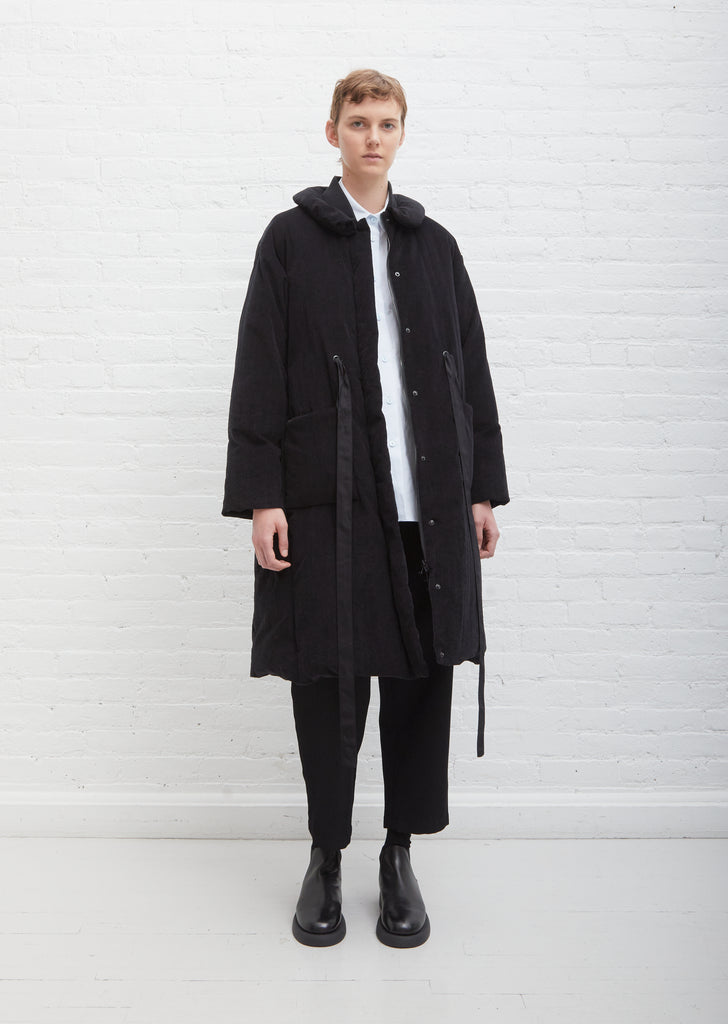Sara Lanzi black down coat with knit rib detailed padded round collar in fine wale corduroy. Self tie at waist in tonal black grosgrain ribbon. Two front patch pockets. Fully lined in black. Oversized fit.