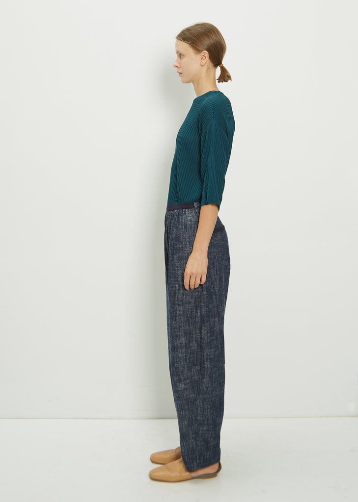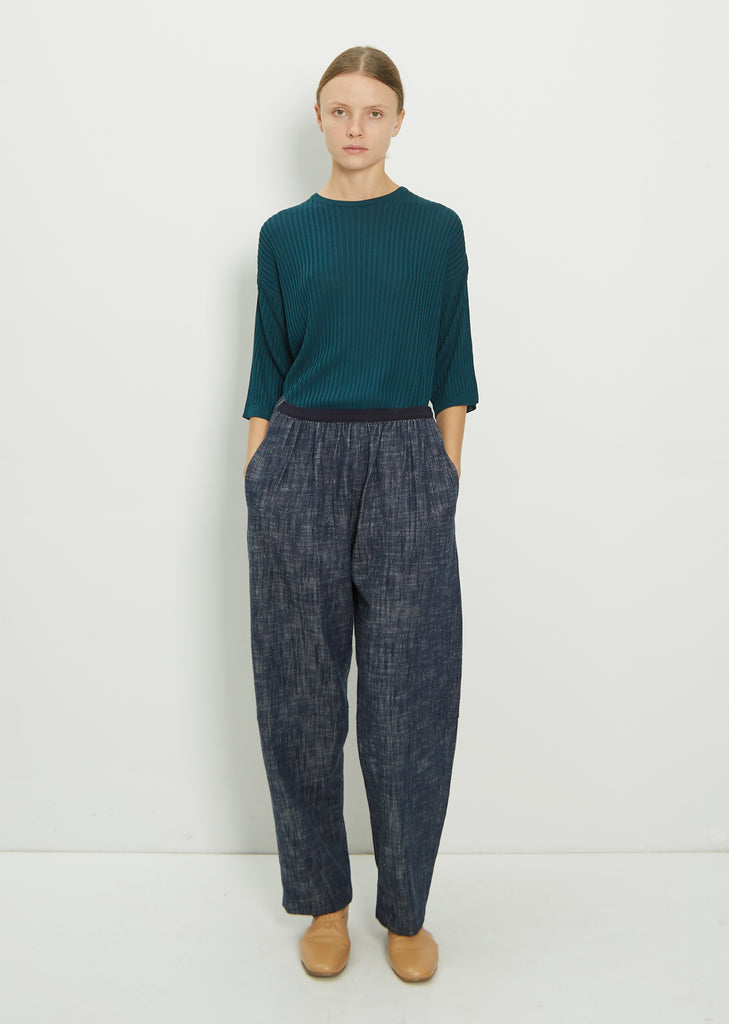 Sara Lanzi denim tapered leg pants with an elasticized waist in cotton. Features a clean waistband, invisible side seam pockets, and two back patch pockets. Relaxed fit. Pulls on.