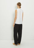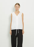 Sara Lanzi top with v-neckline in cotton poplin. Features raglan shoulders, clean center placket, and self tie hem for optional gathering.