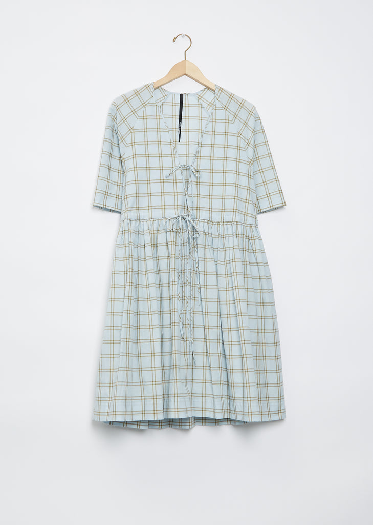 Sara Lanzi blue and green check v-neck short smock dress with raglan sleeves in a cotton silk voile.