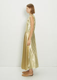 Sara Lanzi gold full length dress with fine pleated skirt and a round neck in polyester polyamide. Invisible back zip closure. Lined.