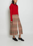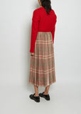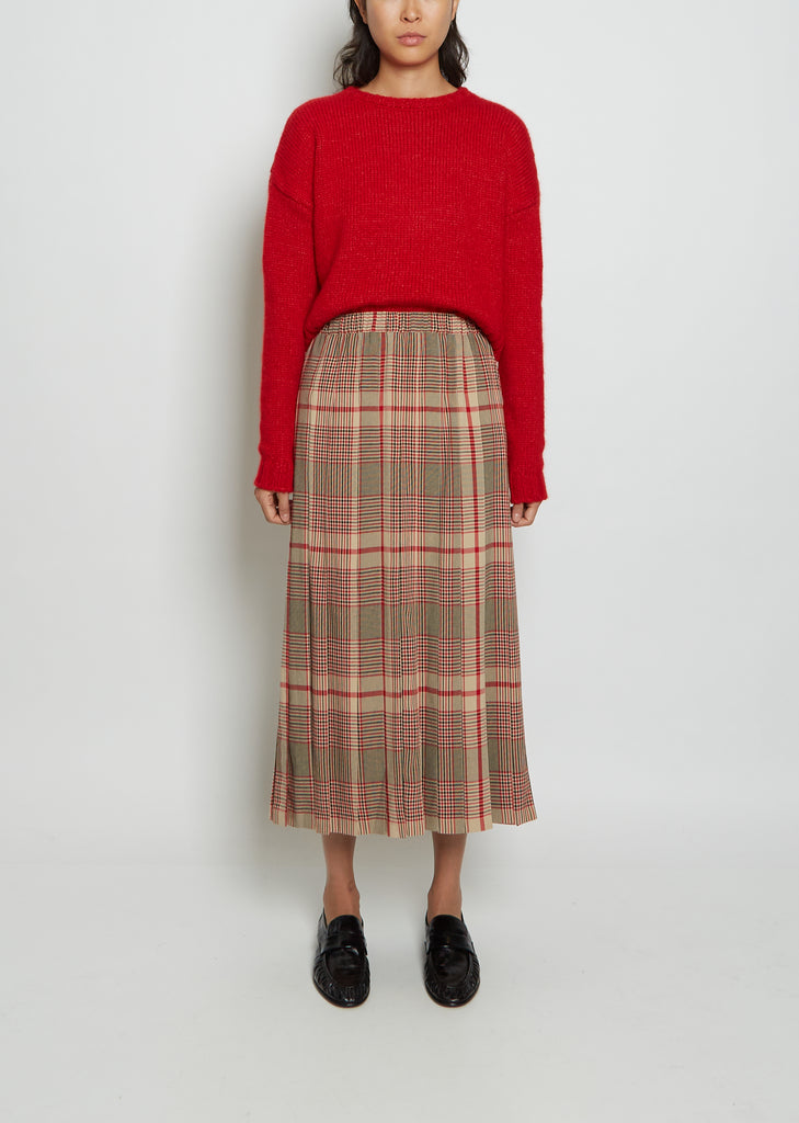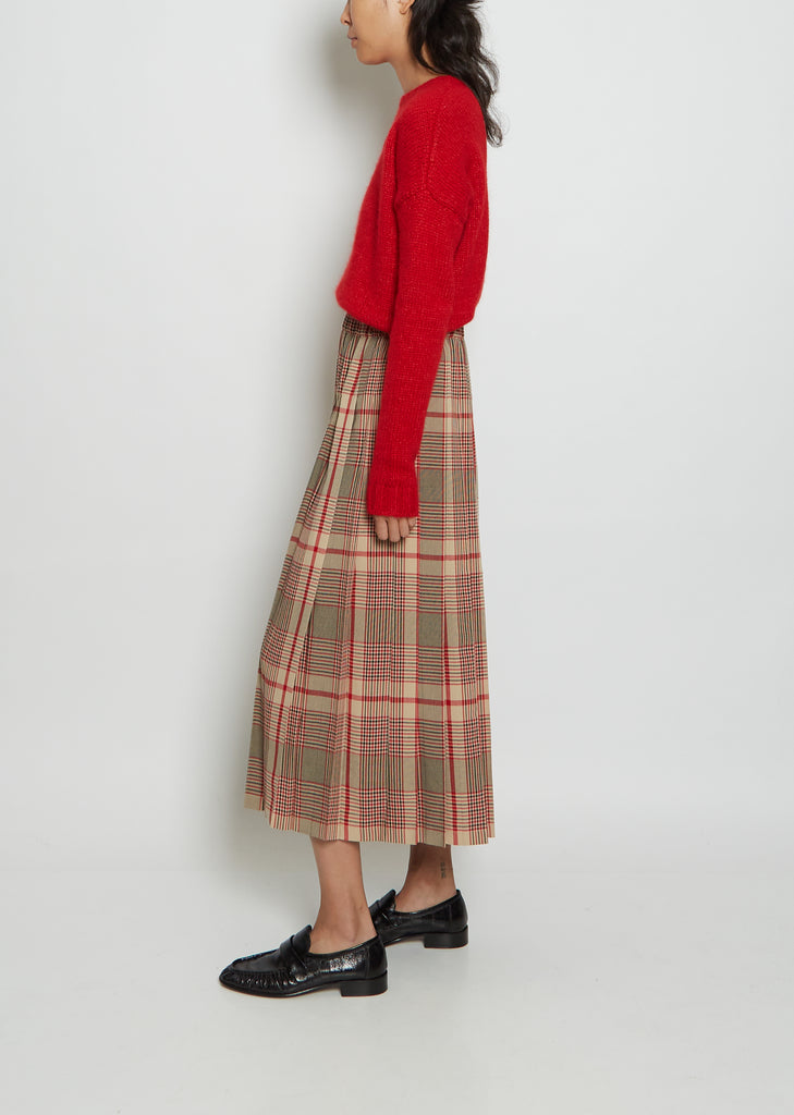 Sara Lanzi red, beige and black plaid pleated midi skirt with an elastic waistband and side slits in a cotton, silk wool voile