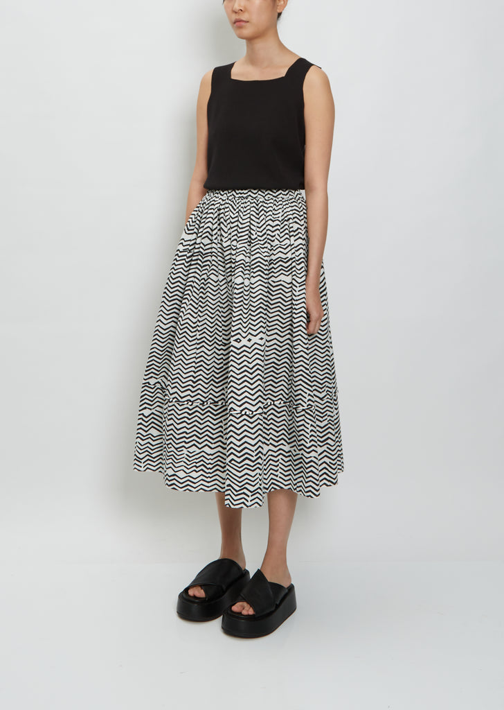Sara Lanzi black and white zig-zag gathered midi skirt in a printed cotton poplin. Also available in Black.