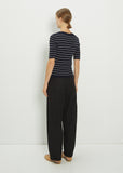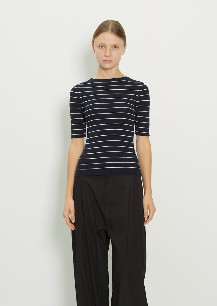 Sara Lanzi navy striped tee with a wide neck and elbow length sleeves in cotton jersey. Closer fit.