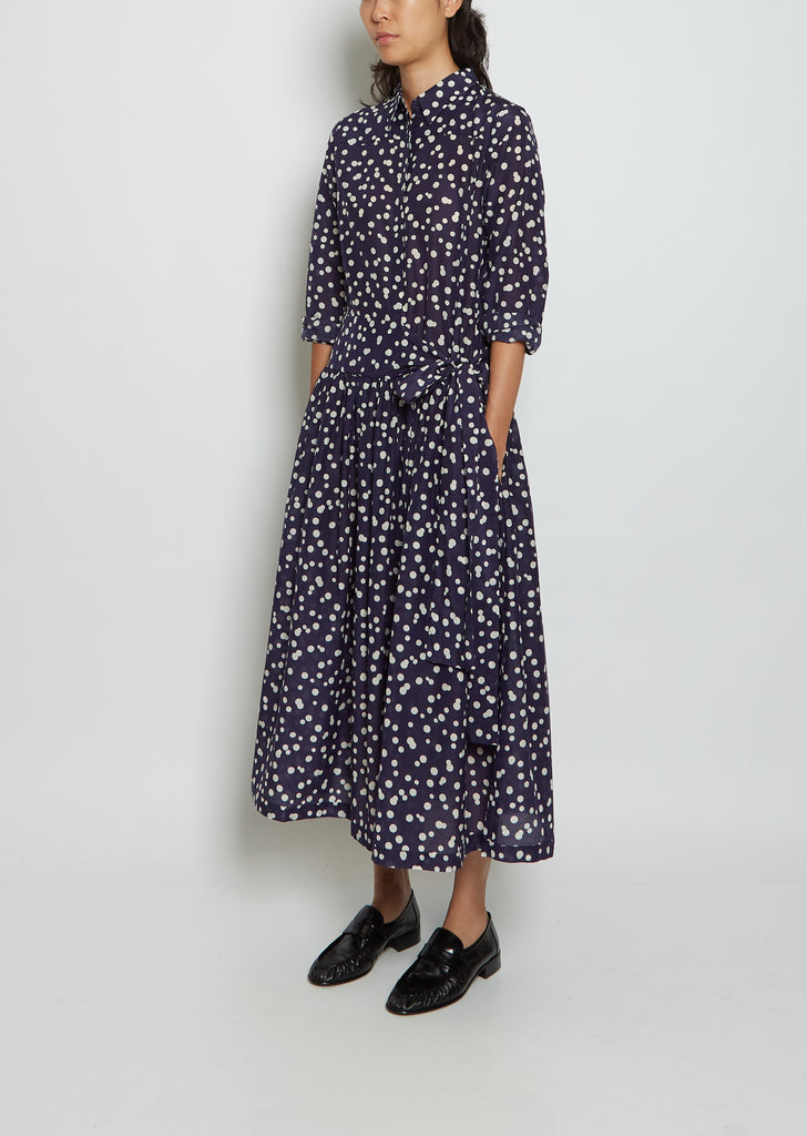 Sara Lanzi navy and white polka dot shirt dress with a self side sash in a lightweight cotton, silk and wool voile.