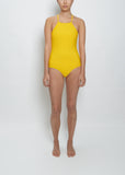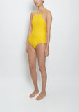 Sara Lanzi yellow one-peice low-back bathing suit with thin criss cross straps and back ruffle detail in a lightweight nylon blend.